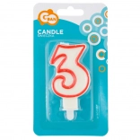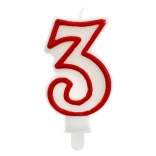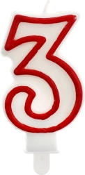 Stilska rođendanska svijeća za tortu broj 3 u bijeloj boji s izraženim crvenim obrubom unijet će svečanu atmosferu u svaku proslavu. S visinom od 7 cm odlično je vidljiva, a zahvaljujući praktičnom postolju lako i stabilno je možete postaviti na tortu.