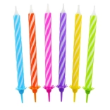 Paket sadrži 24 svijeće u popularnim bojama (plava, crvena, ružičasta, ljubičasta, žuta, zelena) i 12 praktičnih postolja koja olakšavaju stabilno postavljanje na tortu. Svijeće su estetske i funkcionalne – idealan izbor za brzu i efektnu dekoraciju.