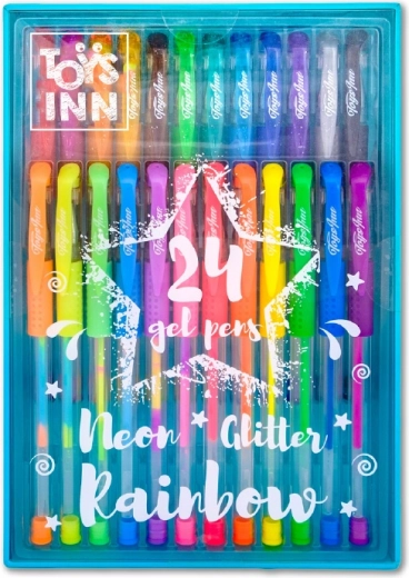 Otkrijte kreativni set od 24 gel olovke TOYS INN koji kombinira neonske, sjajne (glitter) i dugine (rainbow) nijanse. Zahvaljujući glatkom pisanju i višebojnoj tinti idealne su za pisanje, označavanje, ukrašavanje i kreativno stvaranje. Praktično plastično kućište olakšava pohranu i prenošenje.