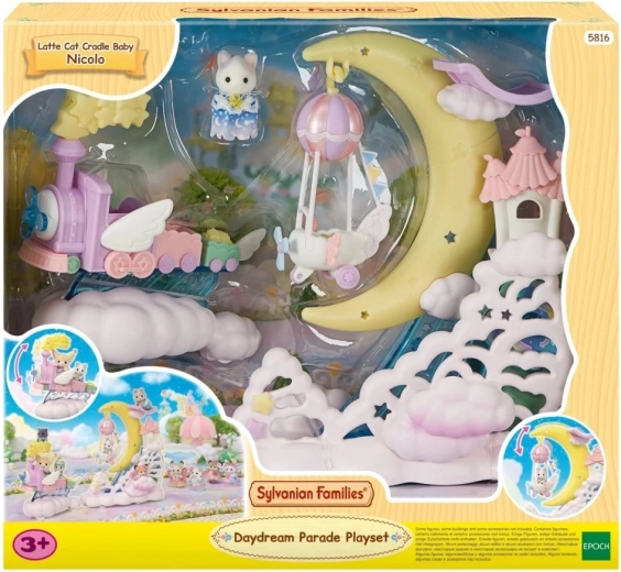 Set Sylvanian Families Parada u oblacima djeci donosi poetski svijet pun snova. Leteća lokomotiva vuče platformu s velikim mjesecom i pričvršćenim balonskim zrakoplovčićem, koji se tijekom vožnje nježno njiše. Dio seta je i slatka figurica mačića Latte u kostimu zvijezde padalice, spremna za čarobne letove.