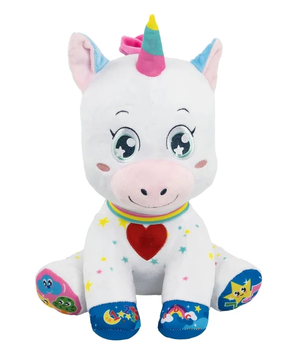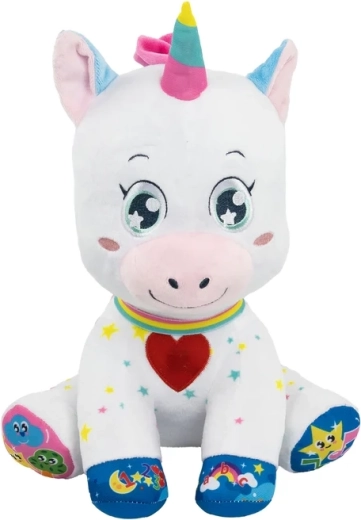 Interaktivni plišani jednorog izvrstan je pratitelj za prvo upoznavanje svijeta. Zahvaljujući pet pametnih tipki djeca na razigran način upoznaju slova, brojeve, oblike i boje, dok vesele melodije i brojalice razvijaju sluh i rječnik. Svjetleća lica i rog privlače pažnju i potiču vizualnu stimulaciju.