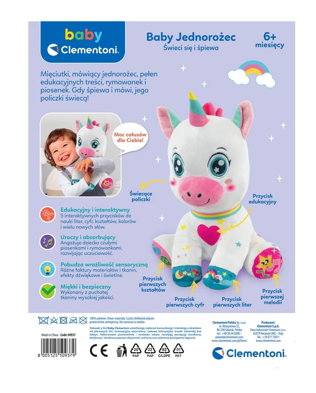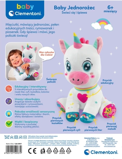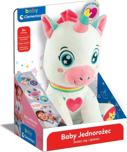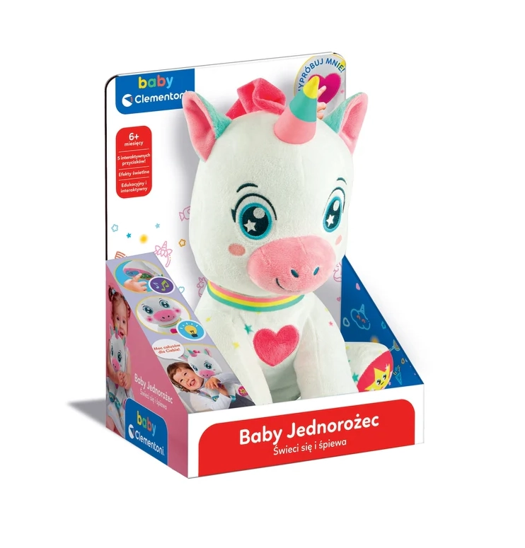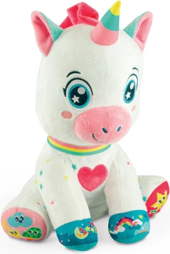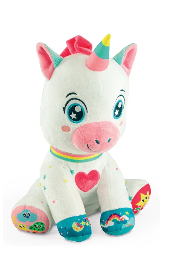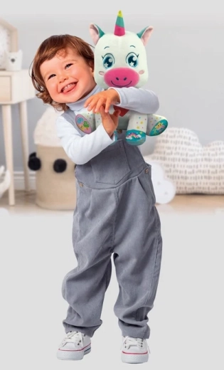 Preslatki interaktivni jednorog marke BABY CLEMENTONI razveselit će djecu od 6 mjeseci. Ima 5 dodirnih tipki na šapicama i srdašcu koje pokreću zvukove, pjesmice i brojalice te uče slova, brojeve, oblike i boje. Mekani, netoksični materijali, osvijetljena lica i svjetleći rog potiču vizualnu percepciju, finu motoriku i razvoj rječnika.