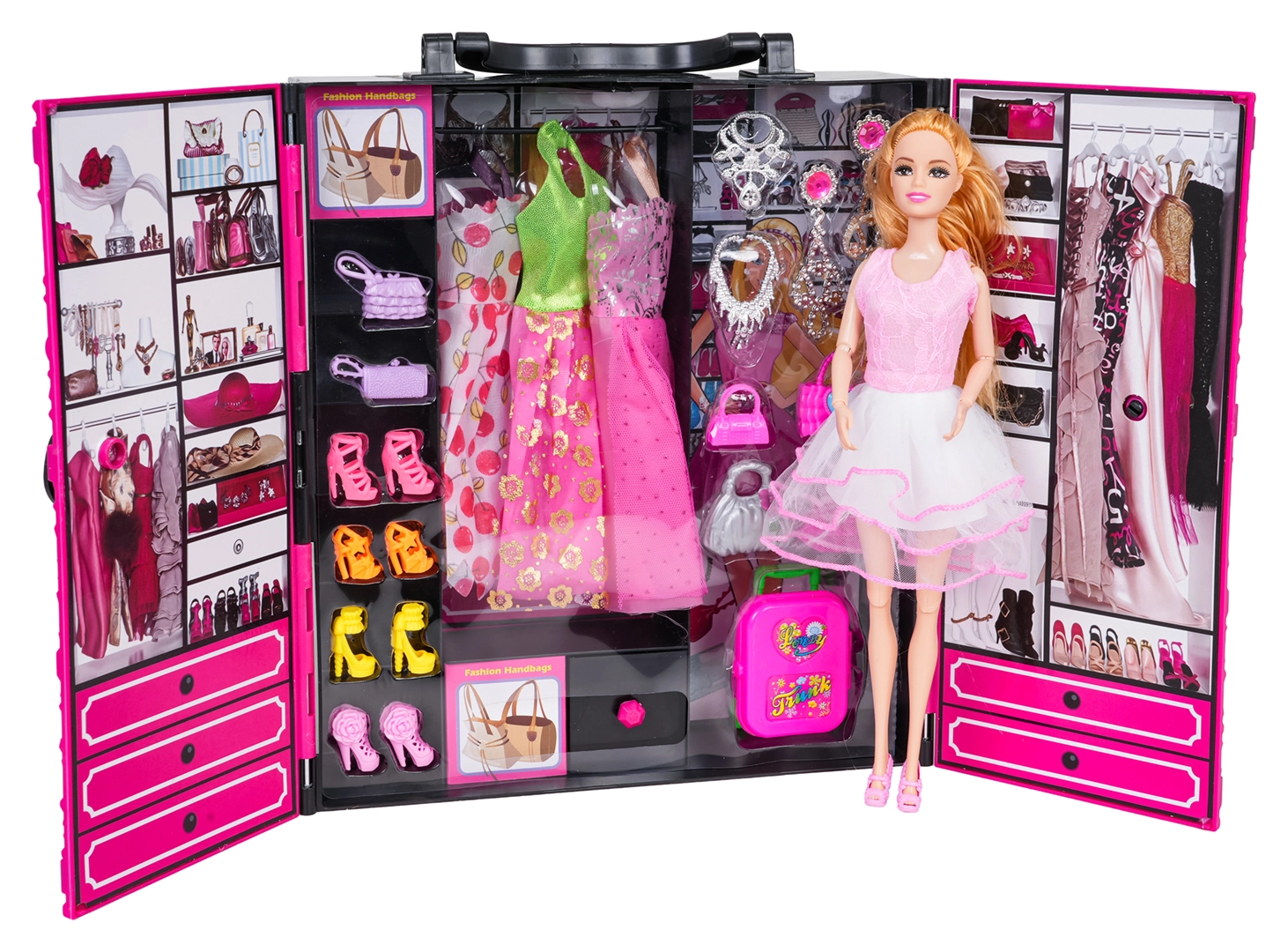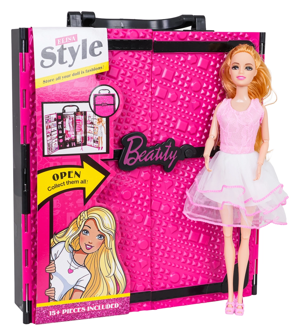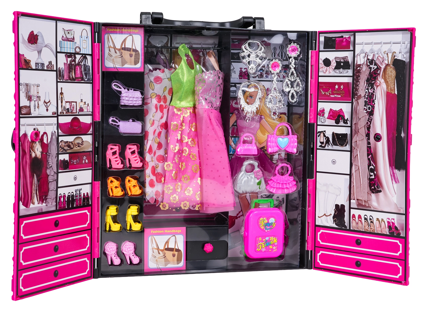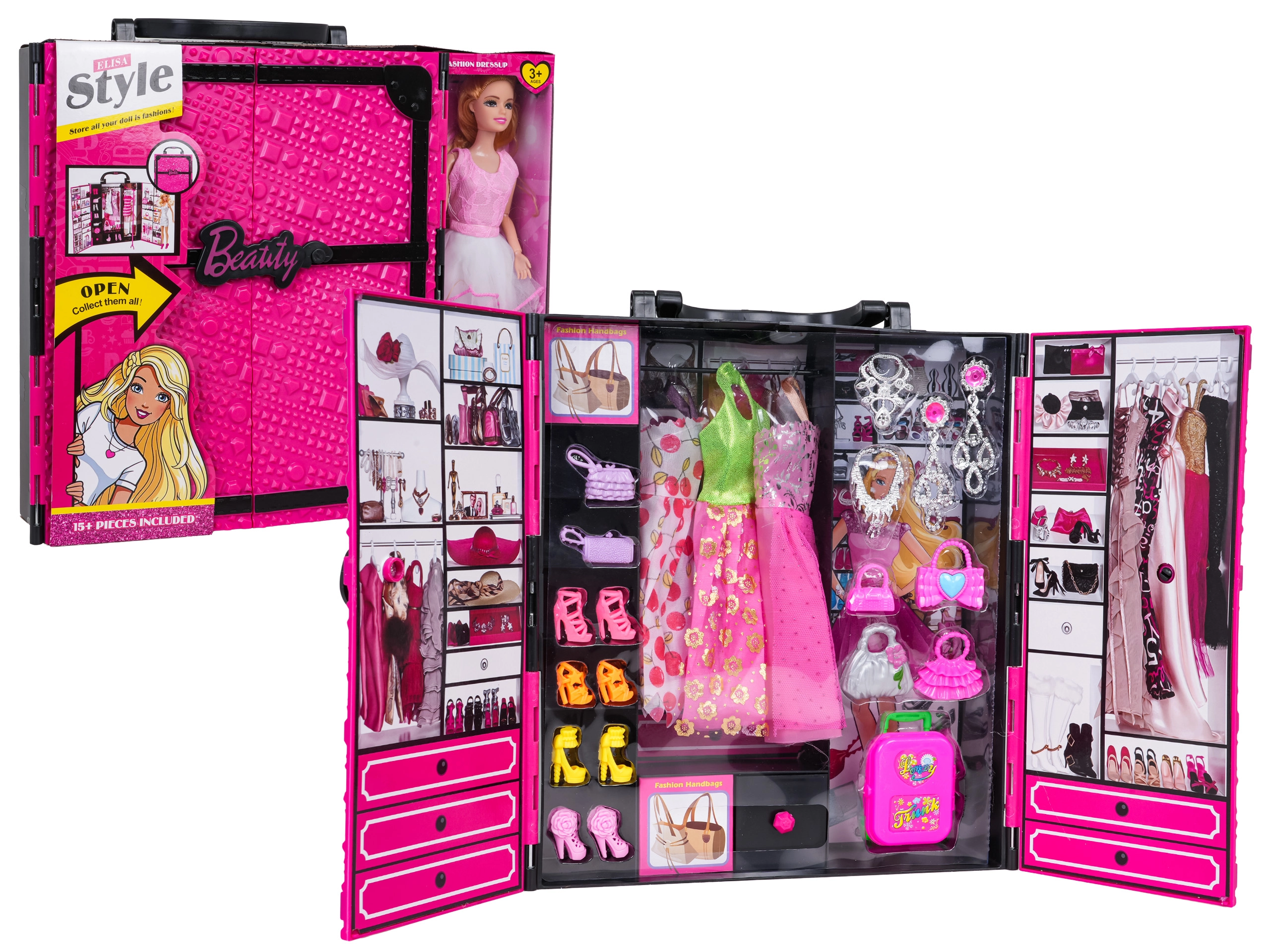 Ovaj bogato opremljen set spaja veliku prijenosnu garderobu i stilsku lutku u prekrasnim haljinama. Unutra ćete pronaći haljine, cipele s potpeticom, torbice, nakit i druge dodatke uredno posložene na policama, u ladicama i na vješalicama. Djeca tako mogu uživati u presvlačenju, igri uloga i vježbati finu motoriku.