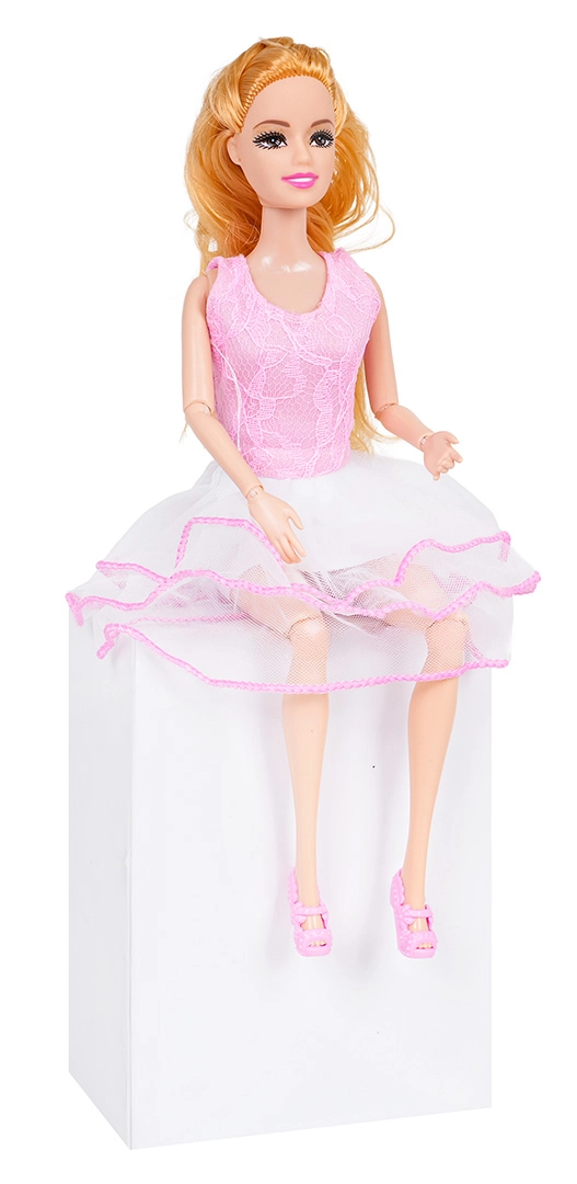 lutka u ball haljini, prijenosna garderoba, 3× večernja/ball haljina, 4 para cipela s potpeticom, 6× torbica, kovčežić, 2× ogrlica, 2× naušnice, kutijica za sitnice