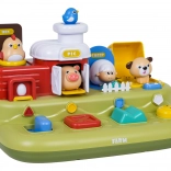 Različiti mehanizmi (pritisak, pomak, okretanje) otkrivaju pilić, prasence, ovčicu i psića. Djeca brzo shvaćaju povezanost između akcije i reakcije te istovremeno uvježbavaju finu motoriku.