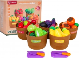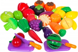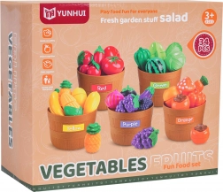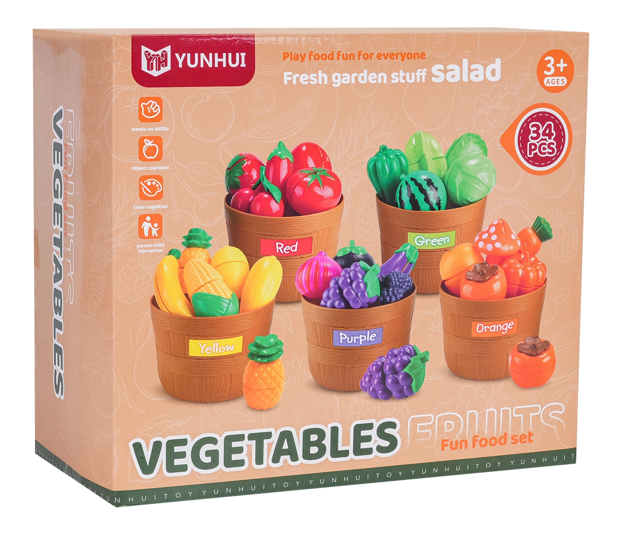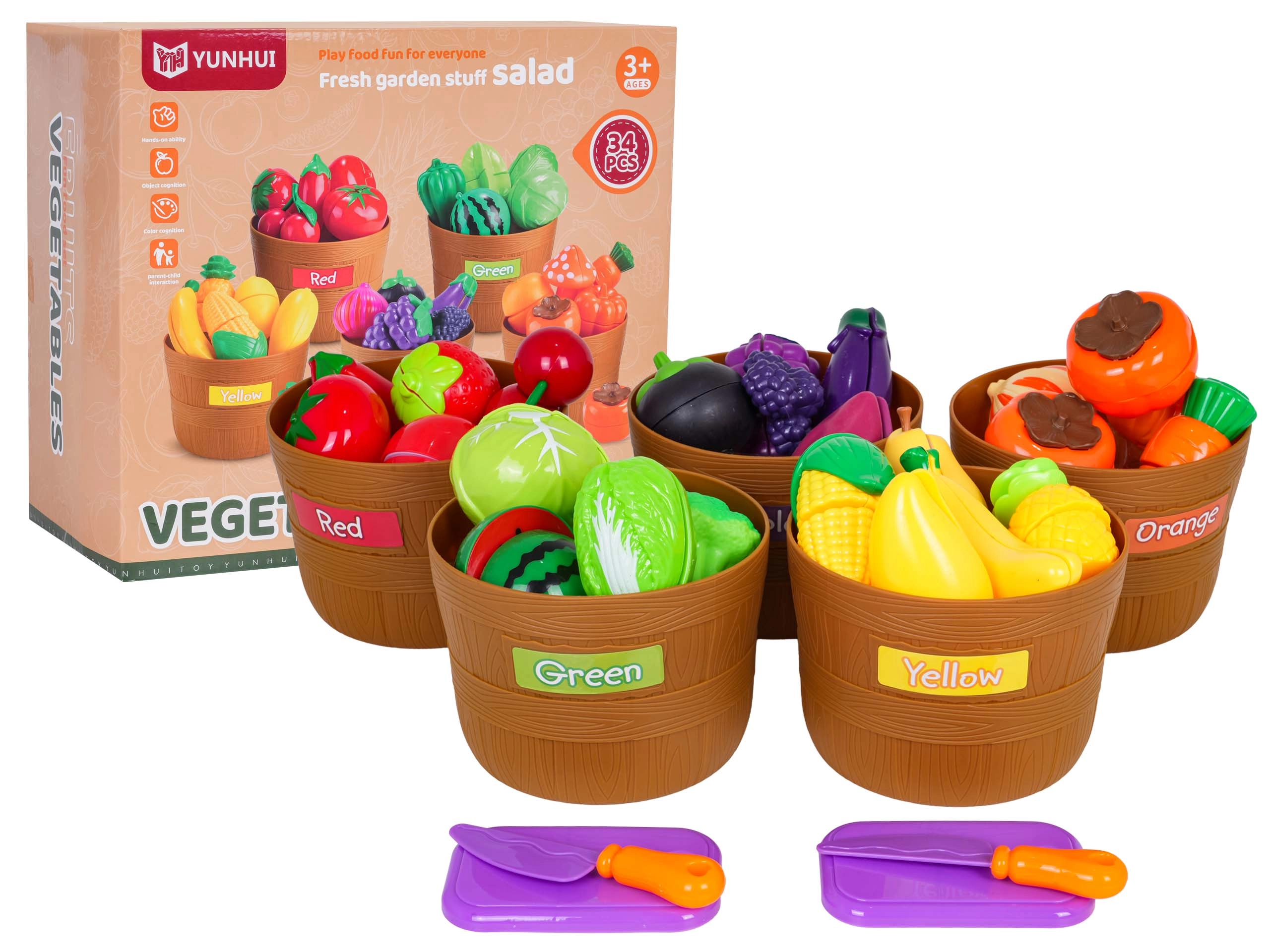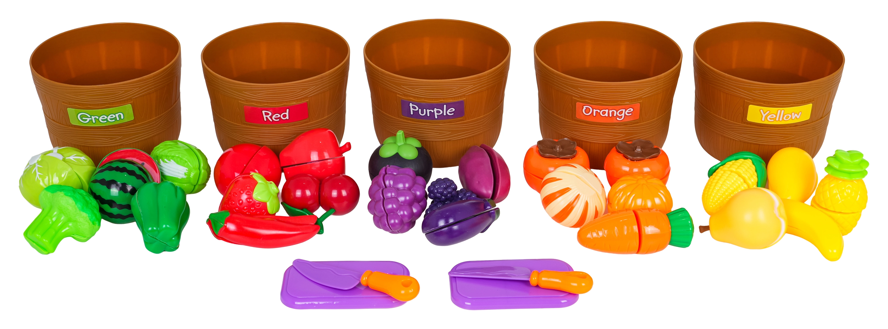 Ovaj šareni set idealan je za male kuhare i kuharice. Djeca mogu voće i povrće razvrstavati u košarice označene bojama (žuta, ljubičasta, narančasta, zelena, crvena) te zahvaljujući spojevima na čičku sigurno ih „rezati“ na priloženim daskama. Čvrsta izrada od kvalitetne plastike izdržat će svakodnevnu igru.