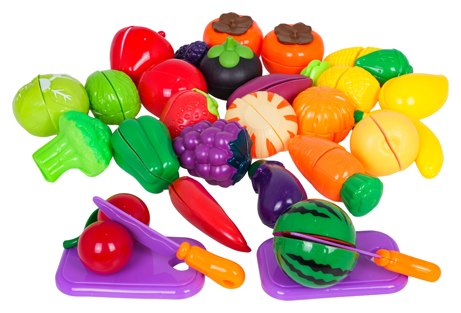 Mnogi plodovi spojeni su čičkom – djeca ih mogu višekratno „rezati“ priloženim plastičnim noževima na daskama bez rizika od ozljede.