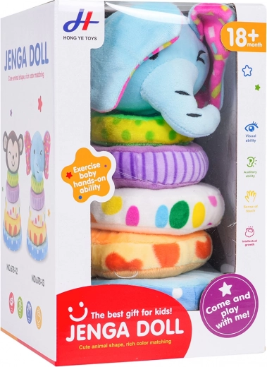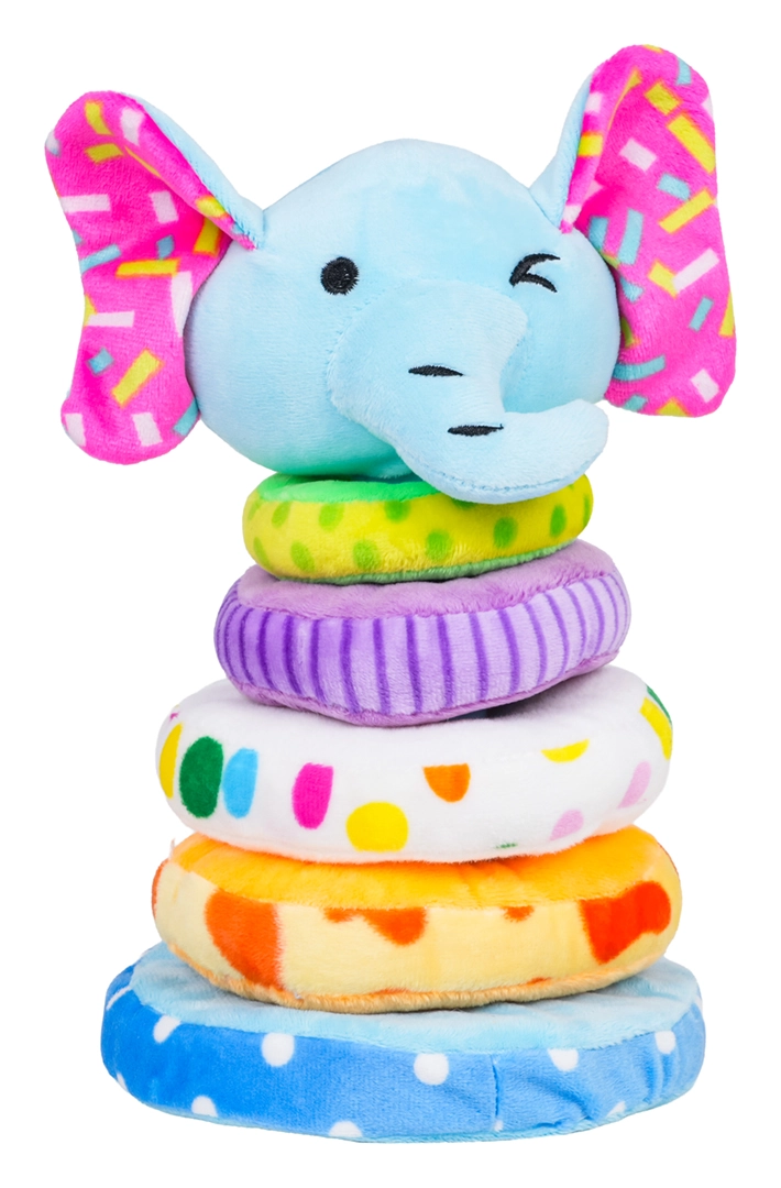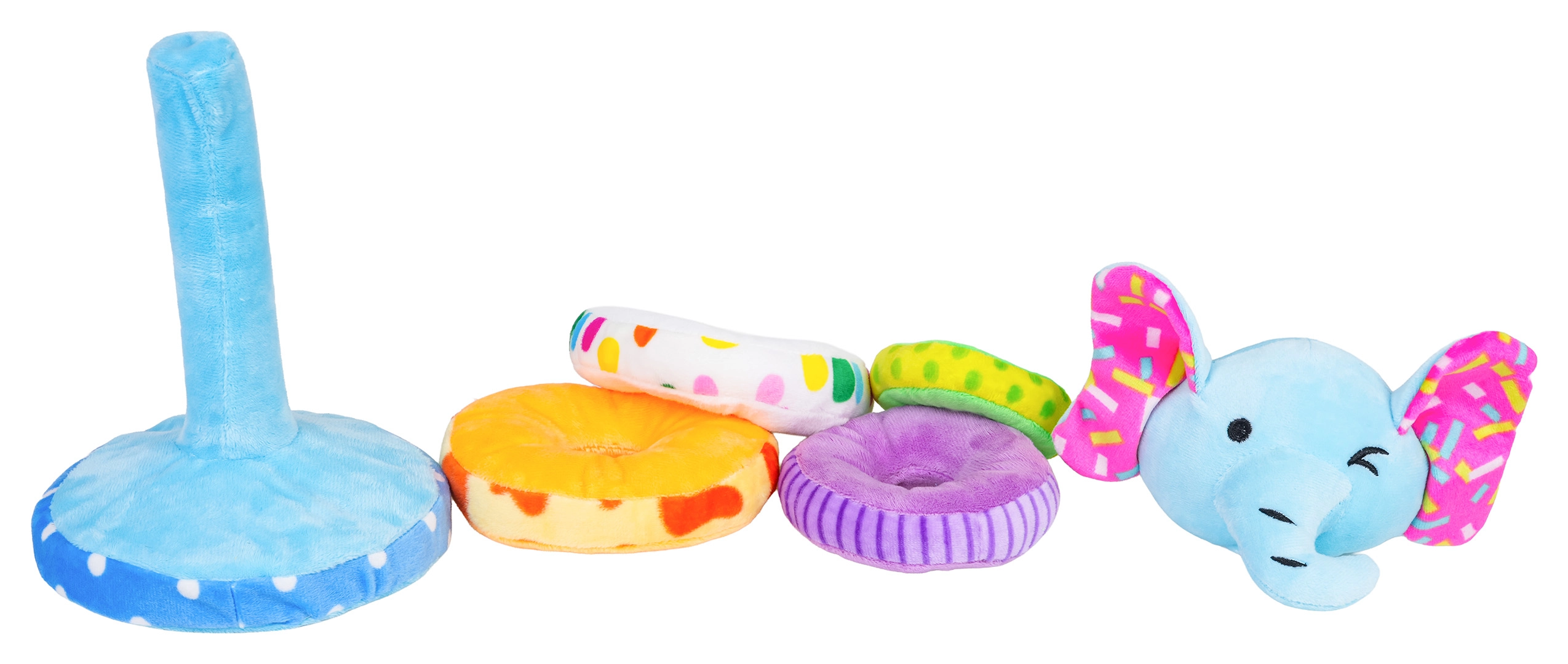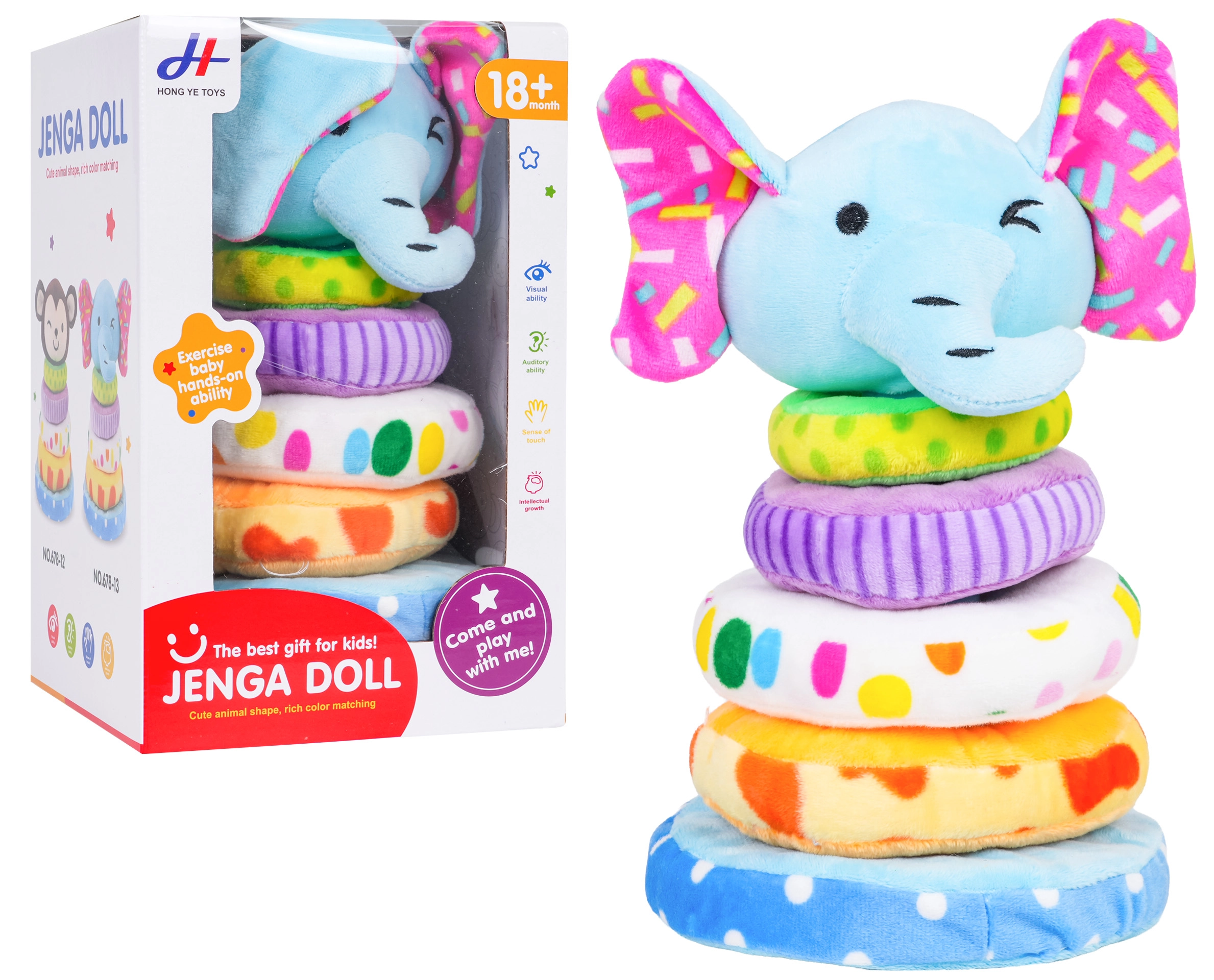 Slatka i sigurna igračka za djecu od 18 mjeseci: meka sklopiva piramida sa slonom od ugodnog pliša. Potiče finu motoriku, koordinaciju oko–ruka, razlikovanje boja i veličina, a zahvaljujući ugrađenoj piskajućoj glavi slona motivira na istraživanje. Žive boje i uzorci privlače pažnju, a meka izvedba idealna je za sigurno igranje.