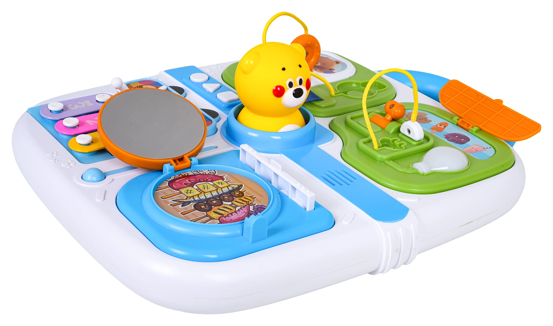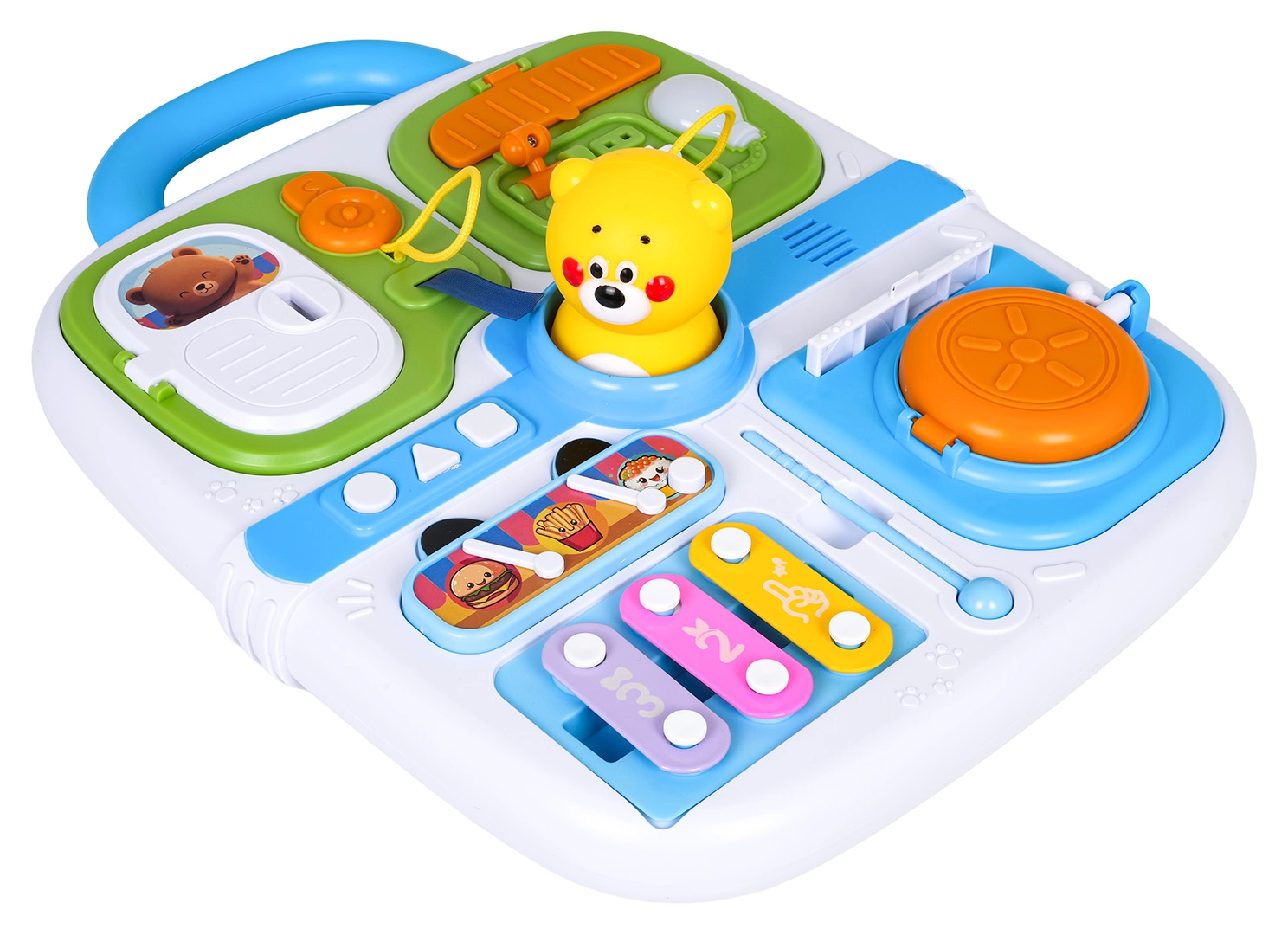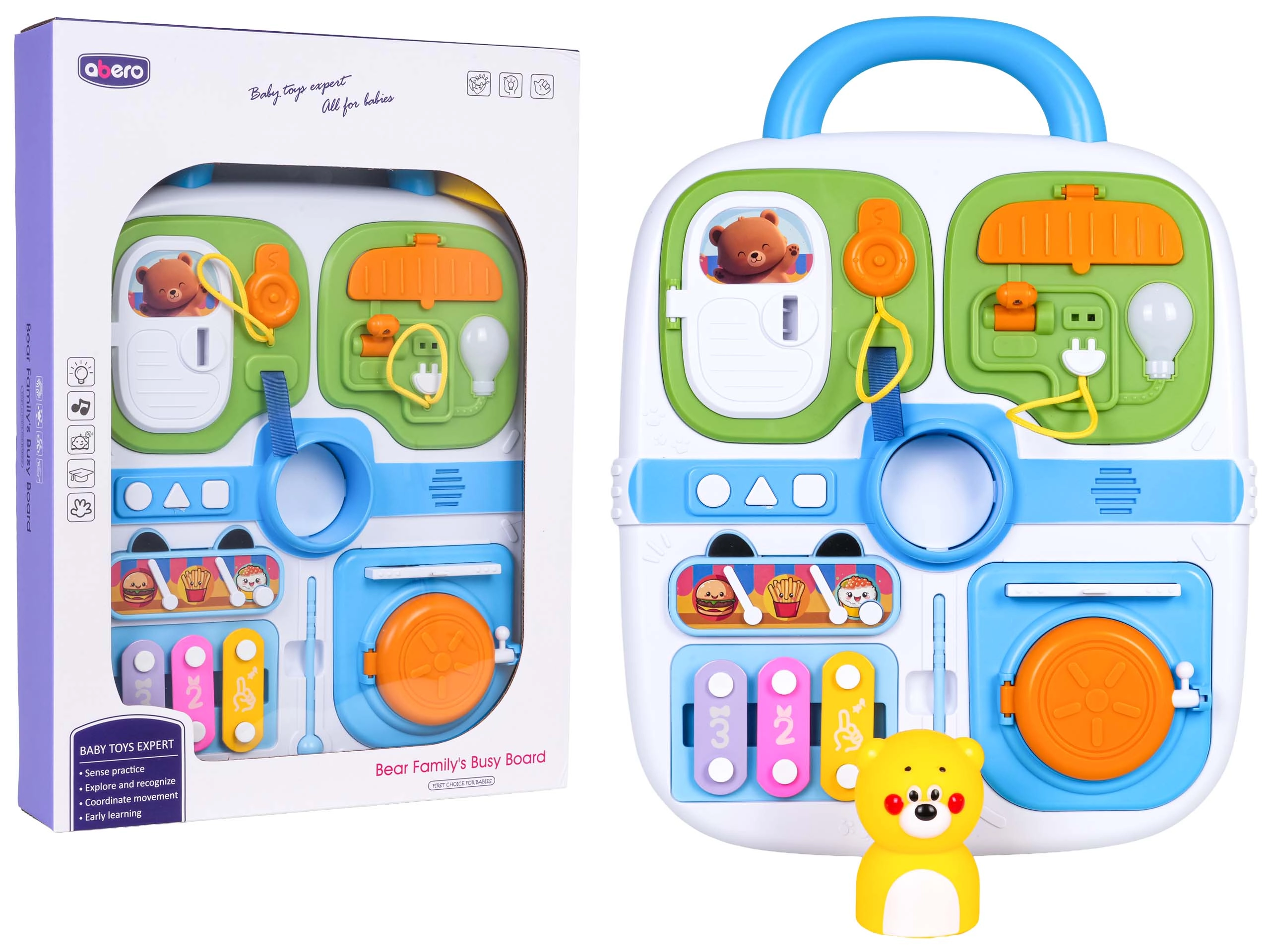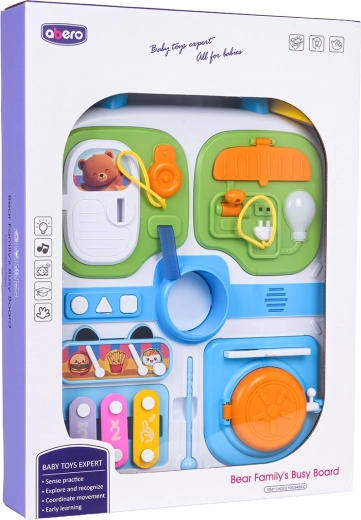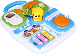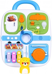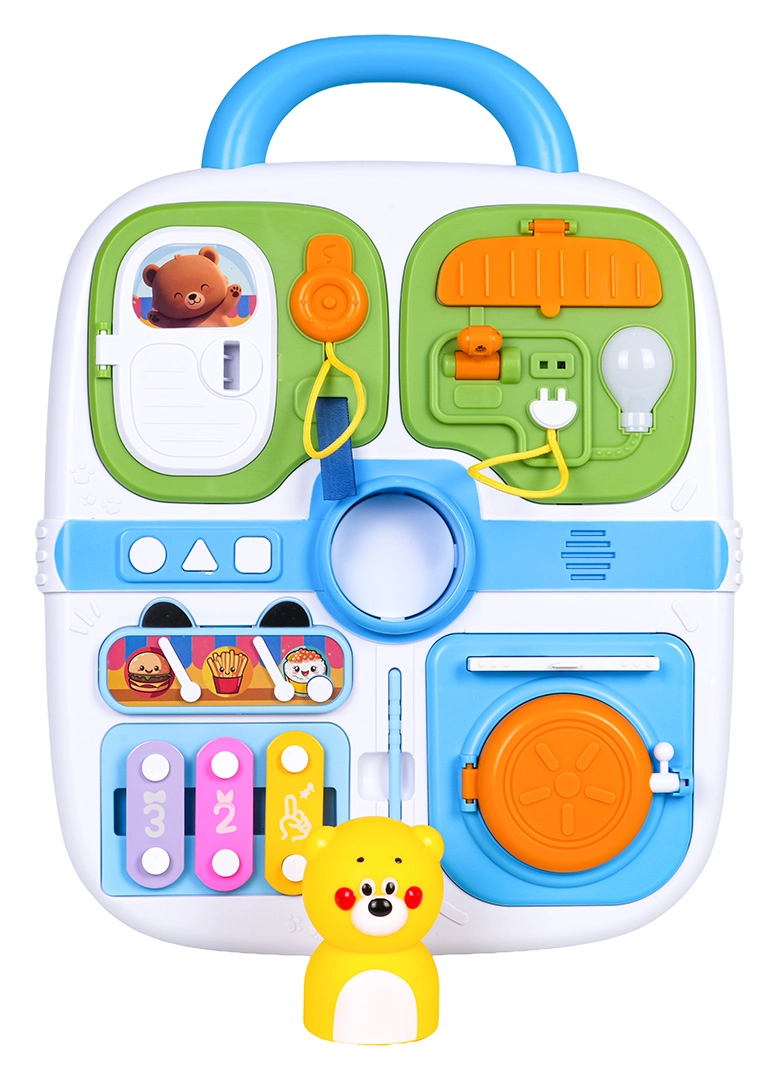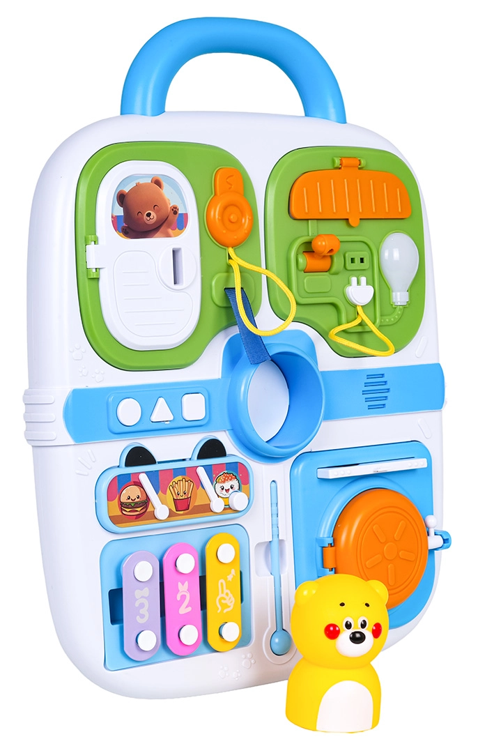 Ovaj plavi manipulativni kofer idealan je izbor za male istraživače. Nudi raznoliku paletu aktivnosti koje potiču dječju znatiželju – od vratašaca na ključ, preko izvlačnih elemenata i okretnih upravljača, do svjetlosnog efekta žarulje nakon spajanja kabela. Središnji medo zazviždi/pišti nakon pritiska, a tri tipke (kružić, trokut, kvadrat) reproduciraju melodije i zabavne zvukove.