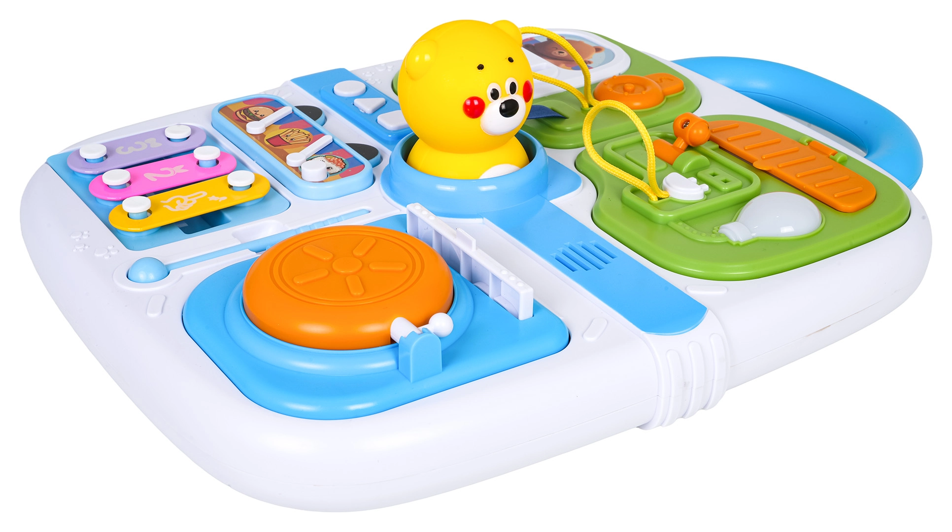 Mini cimbalčići s palicom i pišteći medo u središtu oduševit će djecu i razvijati sluh i ritam. Integrirana ručka olakšava prenošenje.