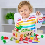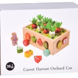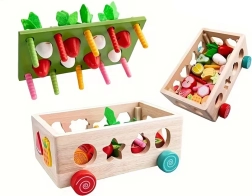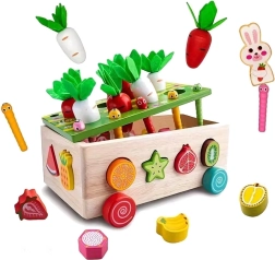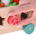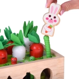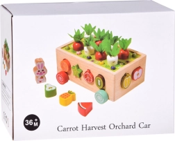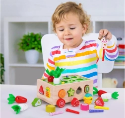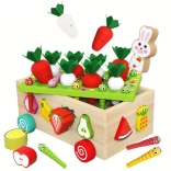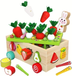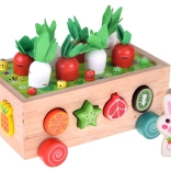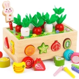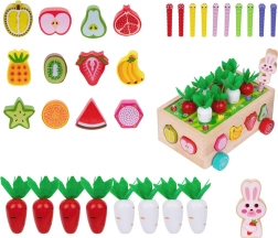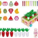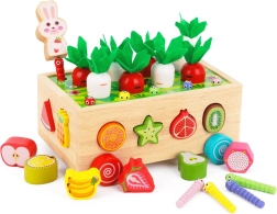 Ovaj višenamjenski drveni set u duhu Montessori pristupa donosi djeci raznolike aktivnosti: sađenje i izvlačenje mrkvica s filcanim lišćem, magnetsko hvatanje crvića uz pomoć figure zečića te klasično razvrstavanje šarenih voćnih oblika u odgovarajuće otvore. Zahvaljujući robusnoj izradi i glatkim rubovima igračka je sigurna i izdržljiva za svakodnevnu igru.