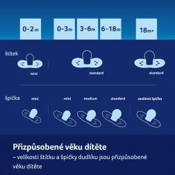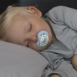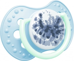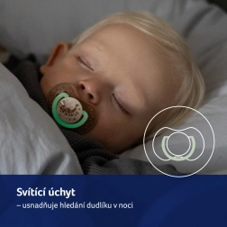 Ergonomski štitnik s ventilacijskim otvorima nježan je prema koži. Svjetleća ručkica olakšava brzo pronalaženje dude tijekom noći.