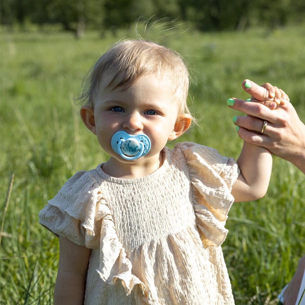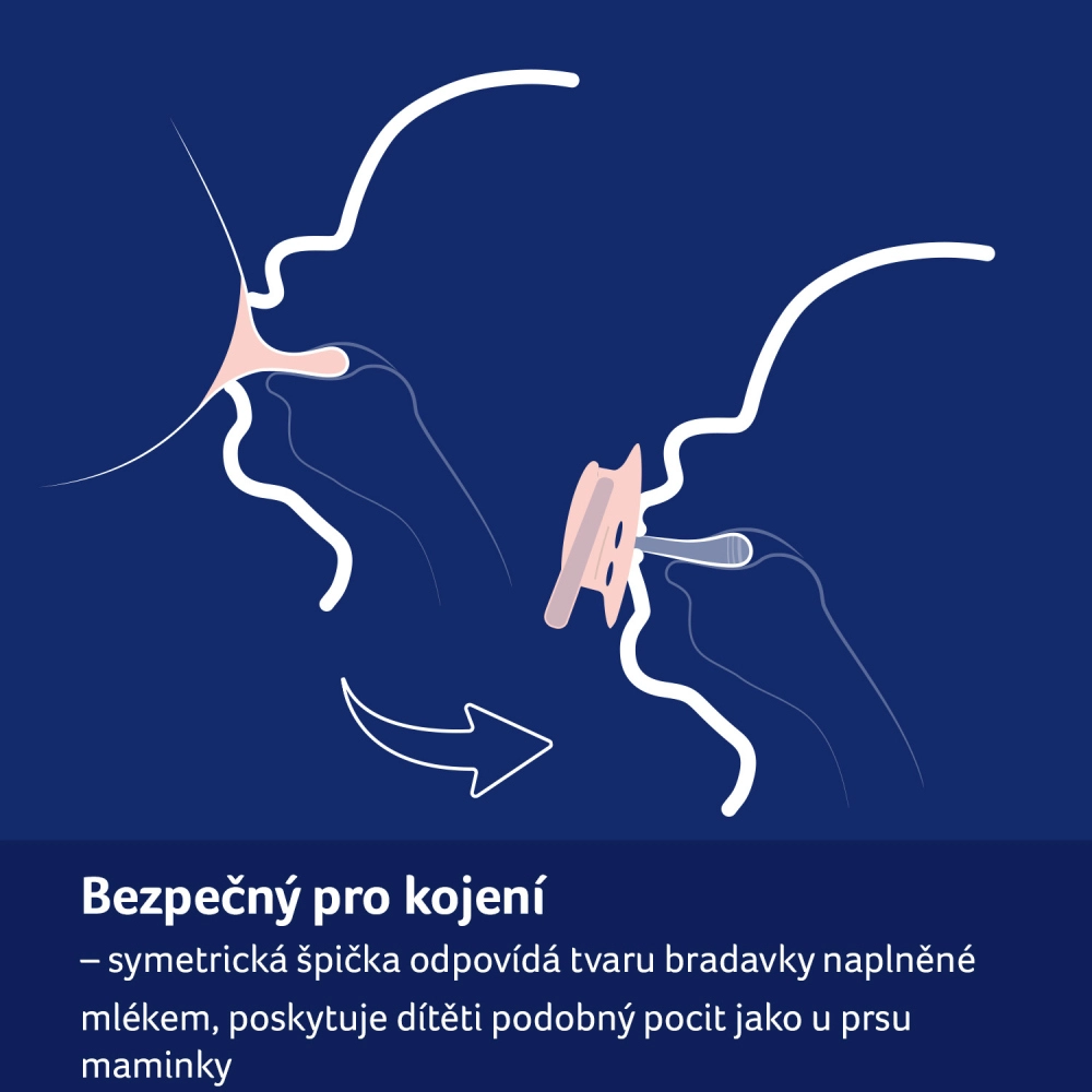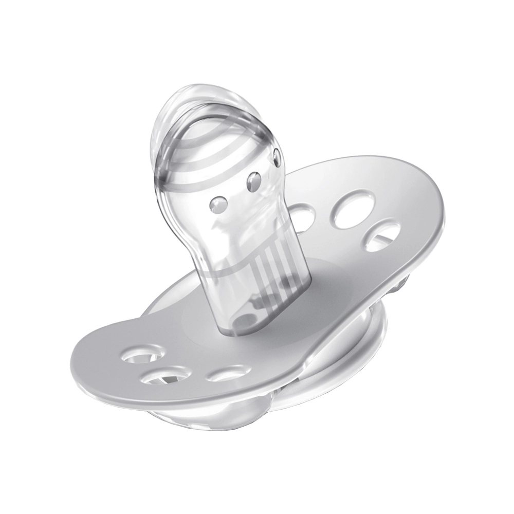 Homogeni silikon se tijekom sisanja ritmički skuplja i širi. Spljošten, simetričan oblik podupire ispravan rad jezika i slobodno zatvaranje usta.
