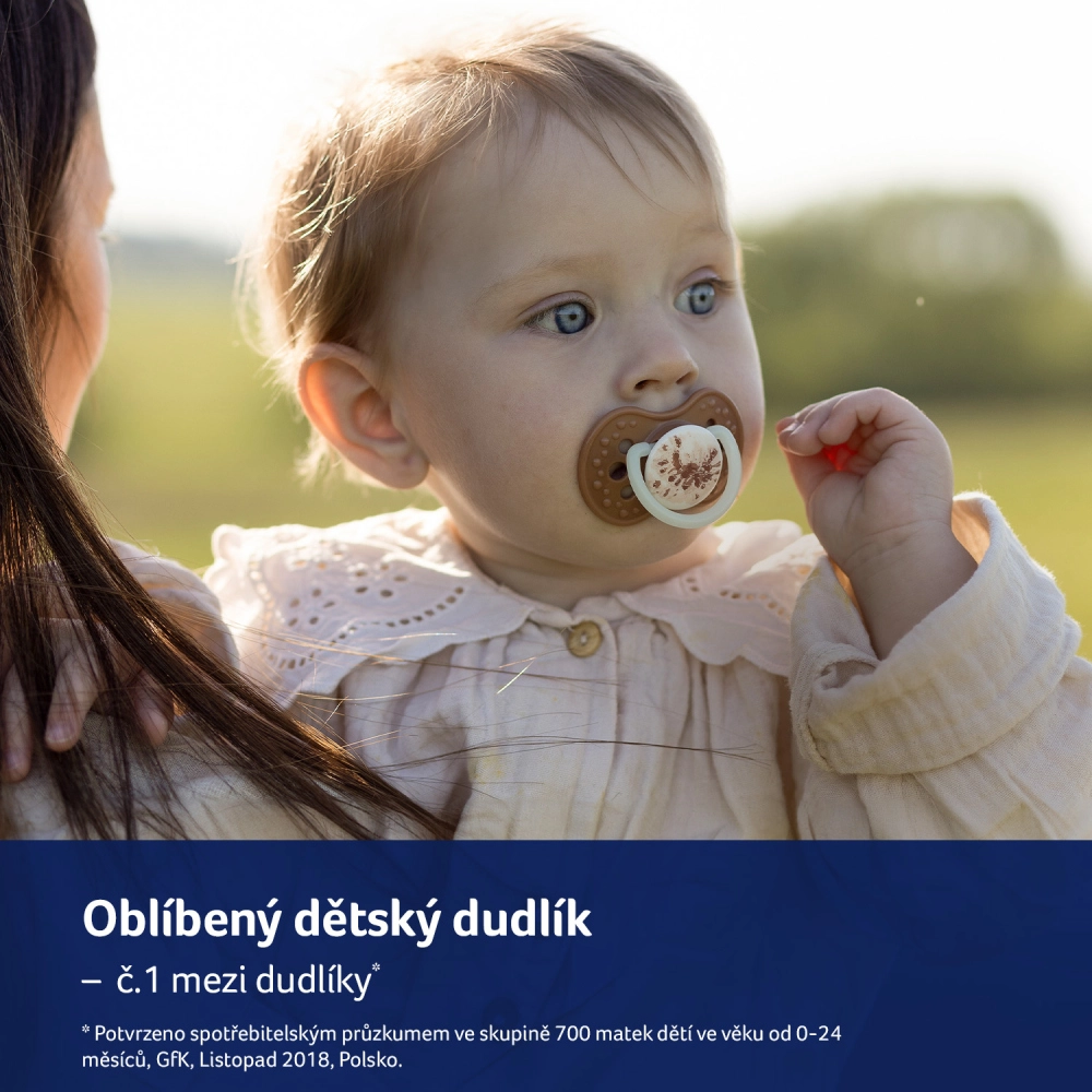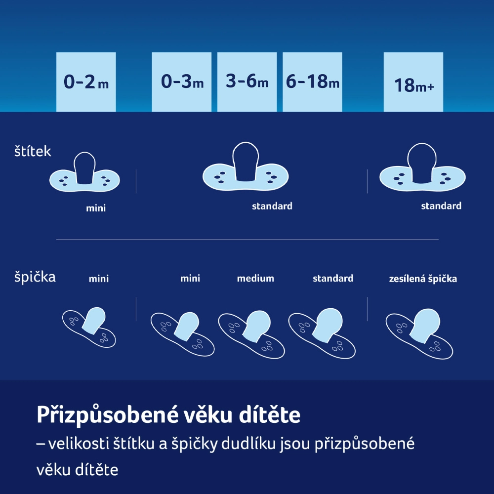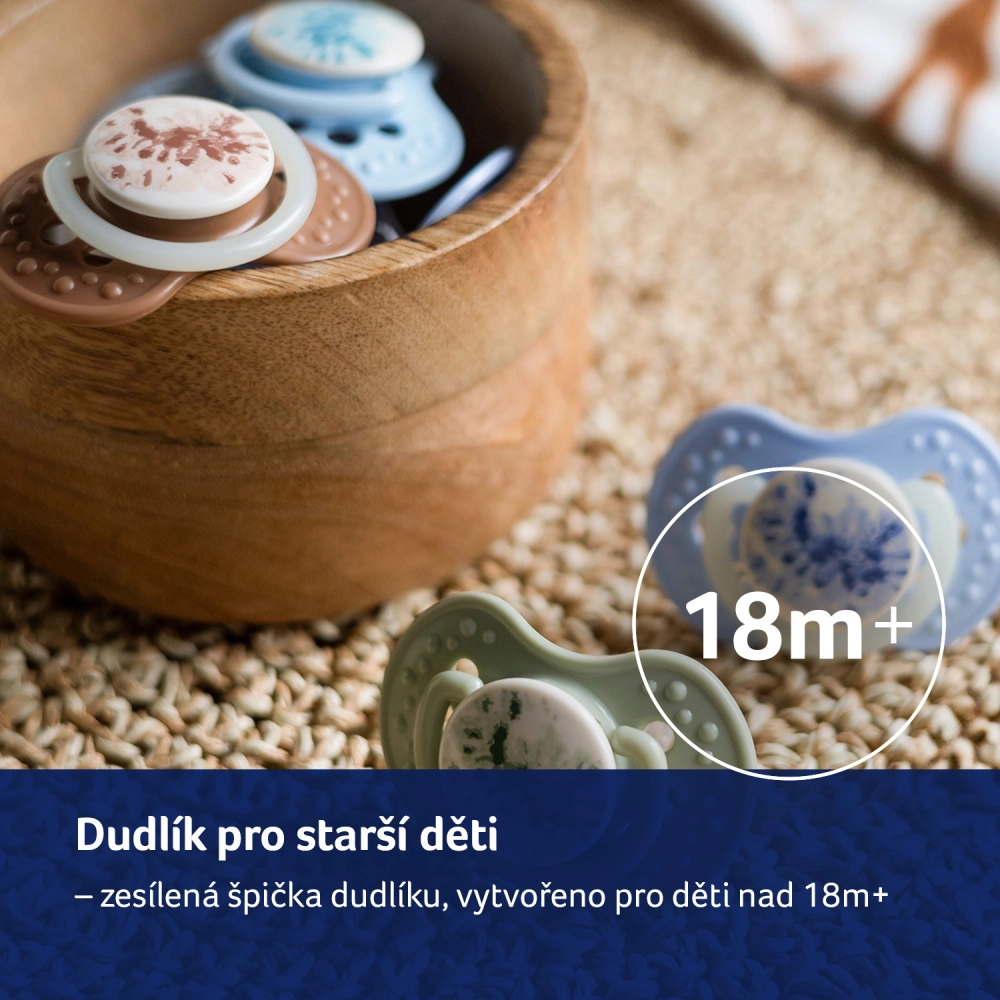 Za stariju djecu (18m+) duda ima ojačanu silikonsku sisu otporniju na grickanje. Svjetleća ručkica omogućuje brzo pronalaženje noću. Materijali su bez BPA, bez okusa i mirisa, pogodni za osjetljive bebe. Uključeno je praktično kućište za higijensko čuvanje.