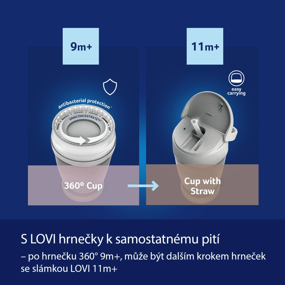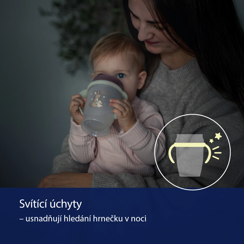 Šalica Lovi 360° Night & Day izvrstan je korak od bočice do obične šalice. Dijete pije prirodno kao iz čaše, ali bez nepotrebnog prolijevanja. Mekani, zabrtvljeni rub omogućuje usisavanje tekućine s bilo kojeg mjesta po obodu, čime podupire pravilne navike pijenja.