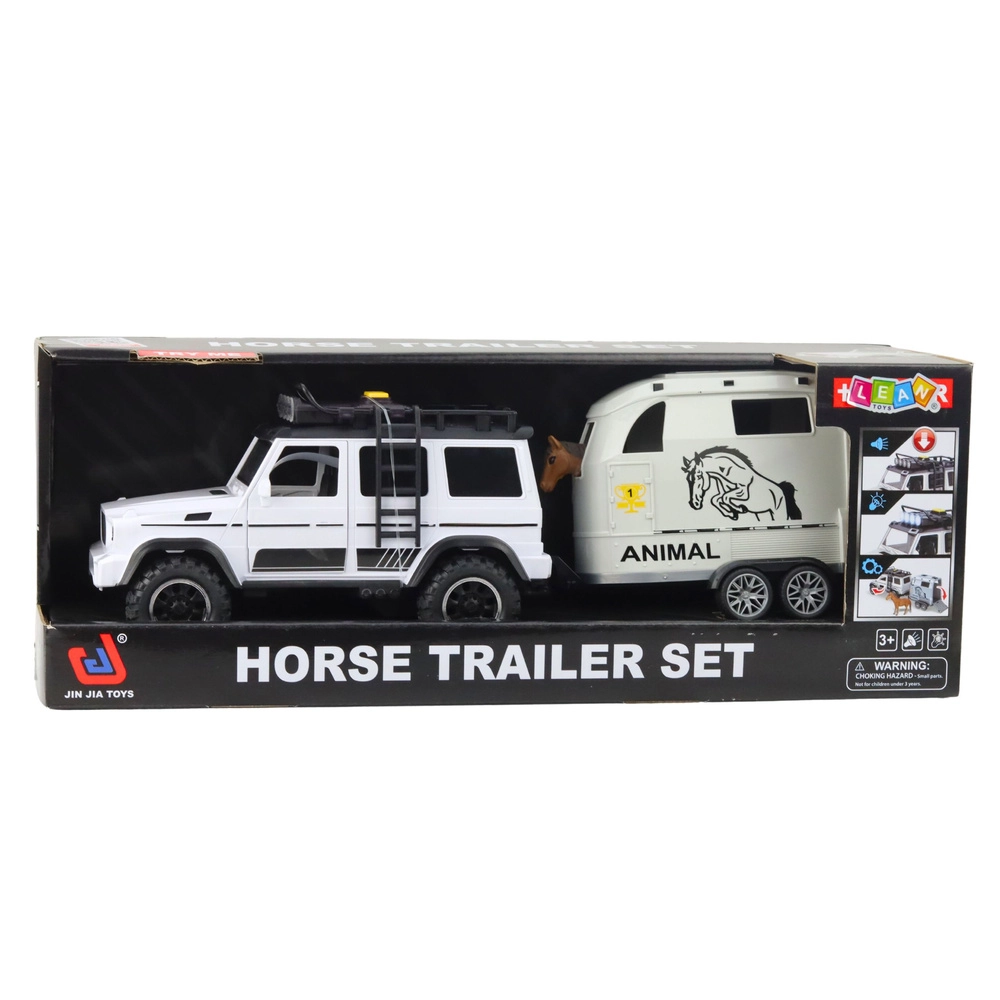 Zabavan set za male ljubitelje životinja i automobila: terensko vozilo s odvojivom prikolicom i figurom konja. Nudi svjetlosne i zvučne efekte, otvarajuća vrata i kvalitetnu izradu od izdržljive plastike za dugačke sate kreativne igre.