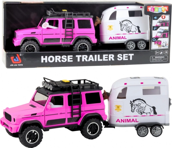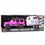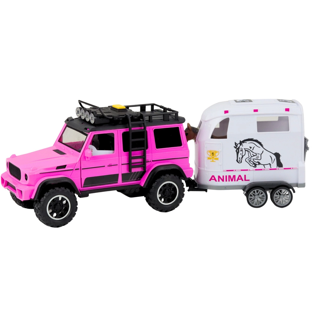 Otkrijte realističan igraći set koji spaja robusno terensko vozilo i prikolicu za konje. Zahvaljujući detaljnoj izradi, kvalitetnoj plastici i atraktivnoj ružičasto-bijeloj kombinaciji boja, igra djeluje autentično i potiče kreativnost i finu motoriku.