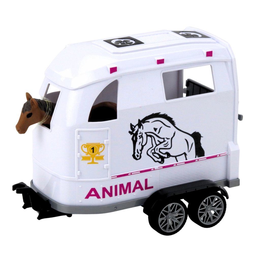Bijela dvoosovinska prikolica s tiskom konja lako se može odvojiti. Unutra je figurica konja za samostalnu igru.