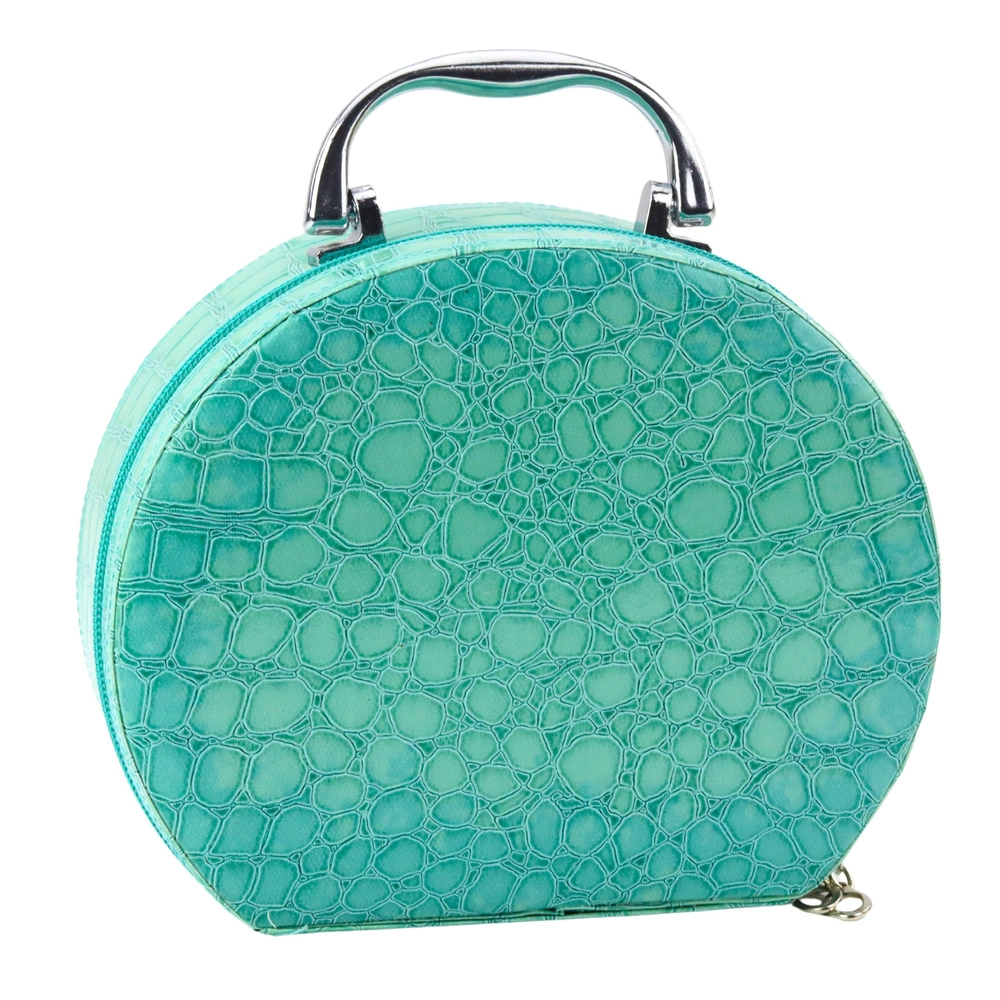 Okrugla tirkizna kozmetička torbica s metalnom ručkom i patentnim zatvaračem drži sve dodatke na sigurnom i uvijek pri ruci – idealno za dom i putovanja.