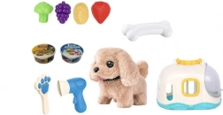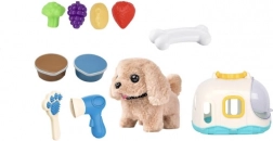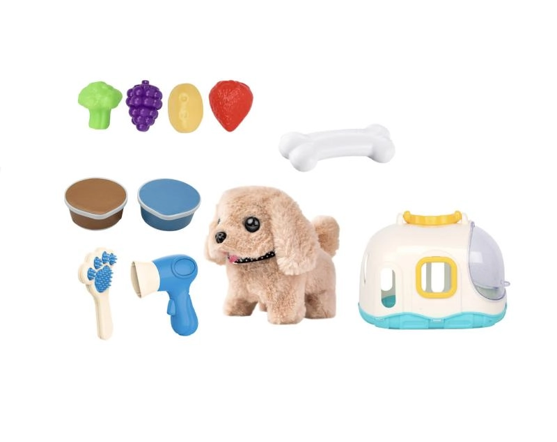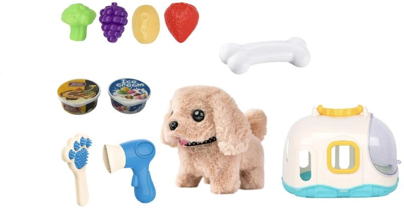 Praktična kućica služi kao udoban dom i prijenosni koferčić, pa djeca mogu ponijeti psića kamo god požele. U pakiranju se nalazi i pribor za njegu – češljić i sušilo – te plastične poslastice u obliku voća i povrća za igru hranjenja.