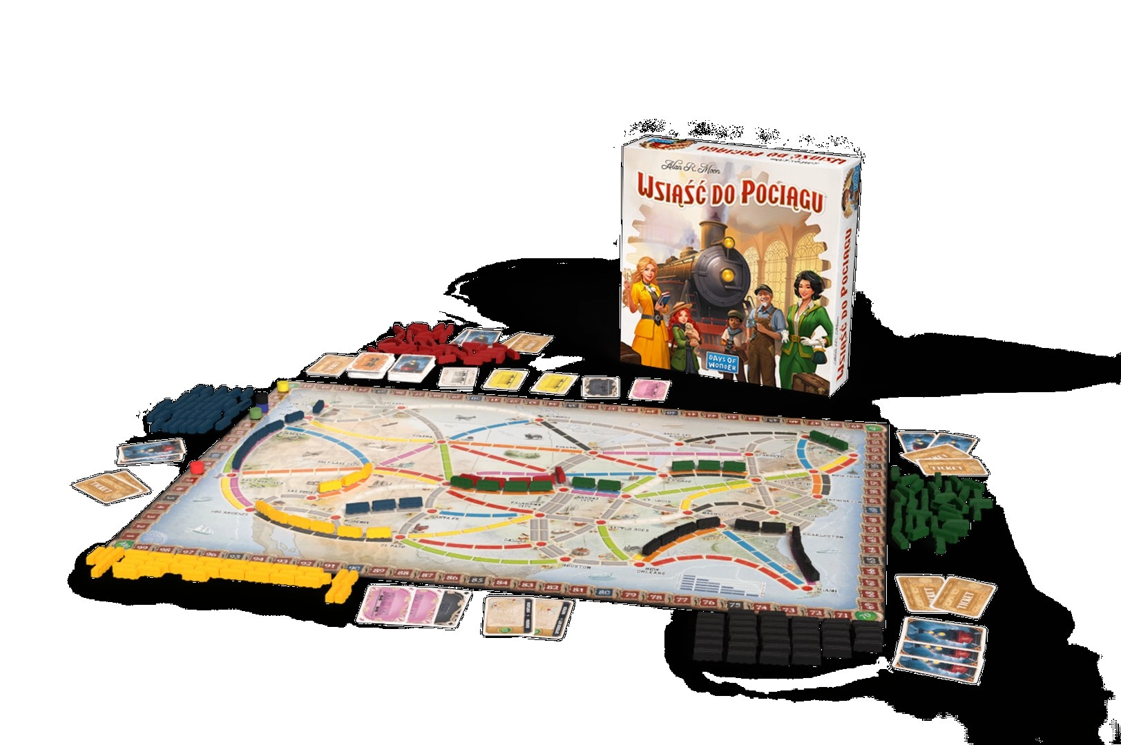 - Igralište s kartom Sjeverne Amerike; 240 obojenih vagona; 110 karata vagona; 33 karte zadataka; karta bonusa za najdužu rutu; 5 bodovnih žetona; pravila igre