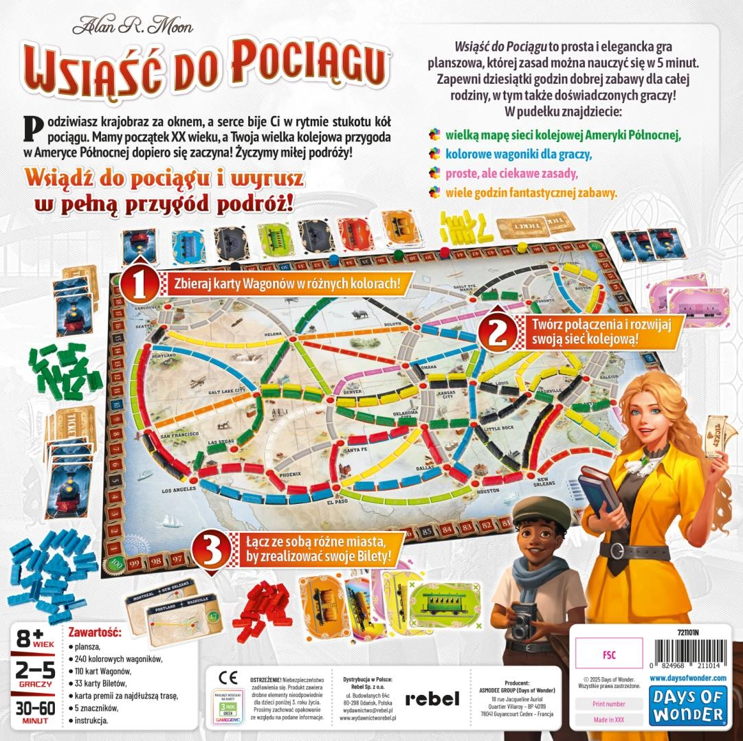 Krenite na avanturističko putovanje diljem Sjeverne Amerike s obiteljskom društvenom igrom Ukrcaj se na vlak. Skupljajte obojene karte vagona, gradite željezničke pruge između gradova i ispunjavajte tajne zadatke za što više bodova. Ovo izdanje nudi ažurirane komponente i poboljšan dizajn, jednostavna pravila i visoku ponovnu igrivost za djecu i odrasle.