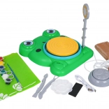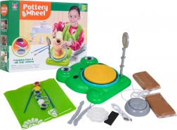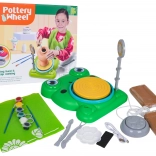 Baza u obliku žabe, rotirajuće kolo, nožni pedala, lampica, alati, boje i 2× glina – sve za trenutno oblikovanje i oslikavanje.