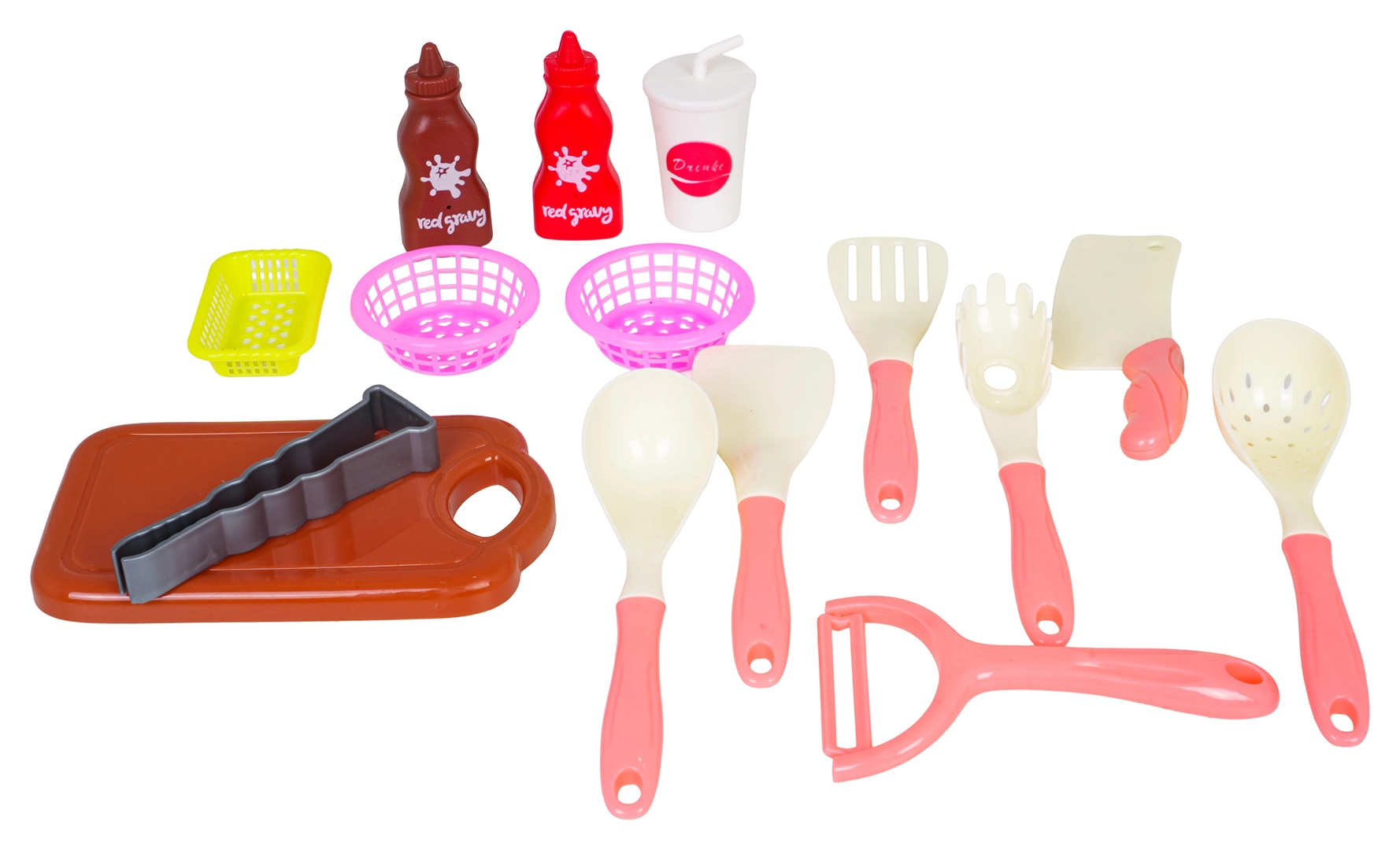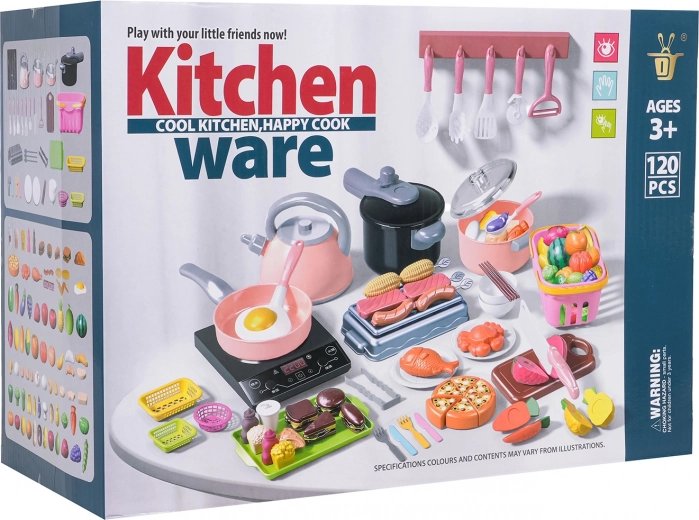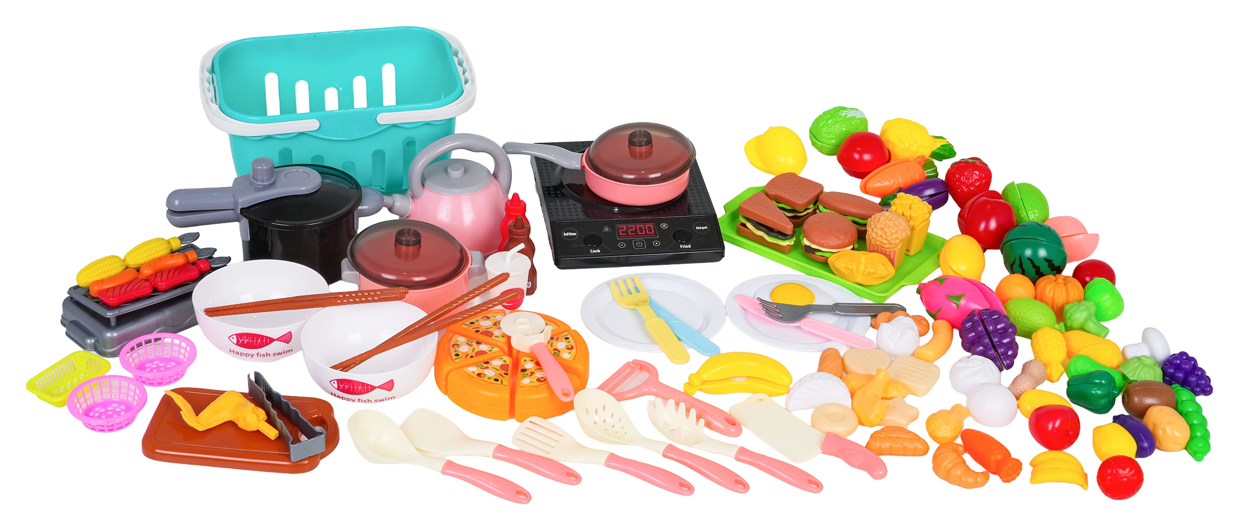 Sastavni dio je indukcijska ploča na 3× AA (nisu uključene) koja prikazuje temperaturu i ima dodirno upravljanje; tu su i roštilj, set posuđa (igračkasti električni čajnik, ekspres lonac, tava, lonac), servisni setovi (zdjelice, tanjuri, pribor za jelo, štapići), namirnice za rezanje s čičkom, pizza s rezačem, ražnjići i mnogo toga. Sve je upotpunjeno košaricom za kupnju i poslužavnikom za realističnu igru.