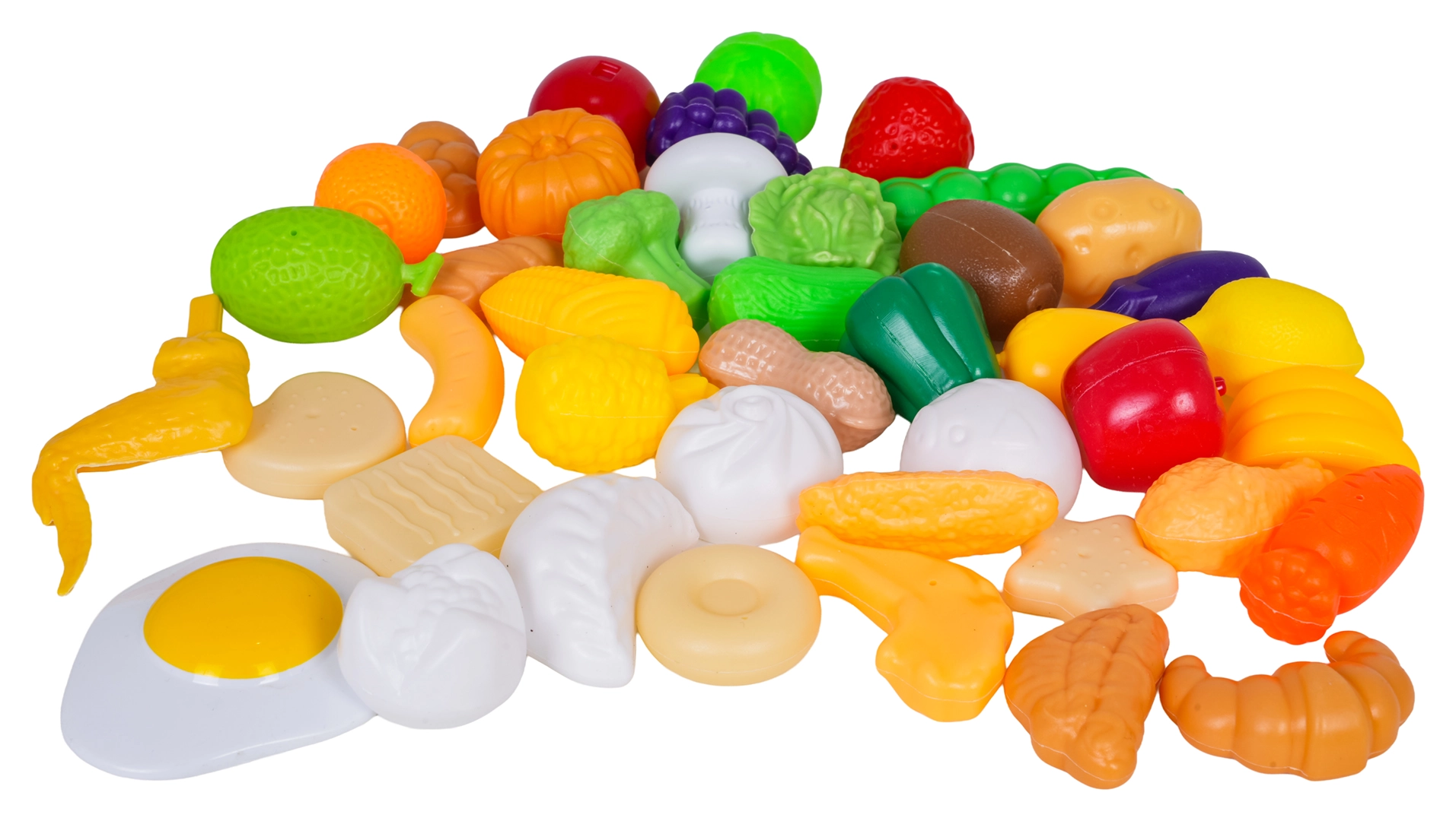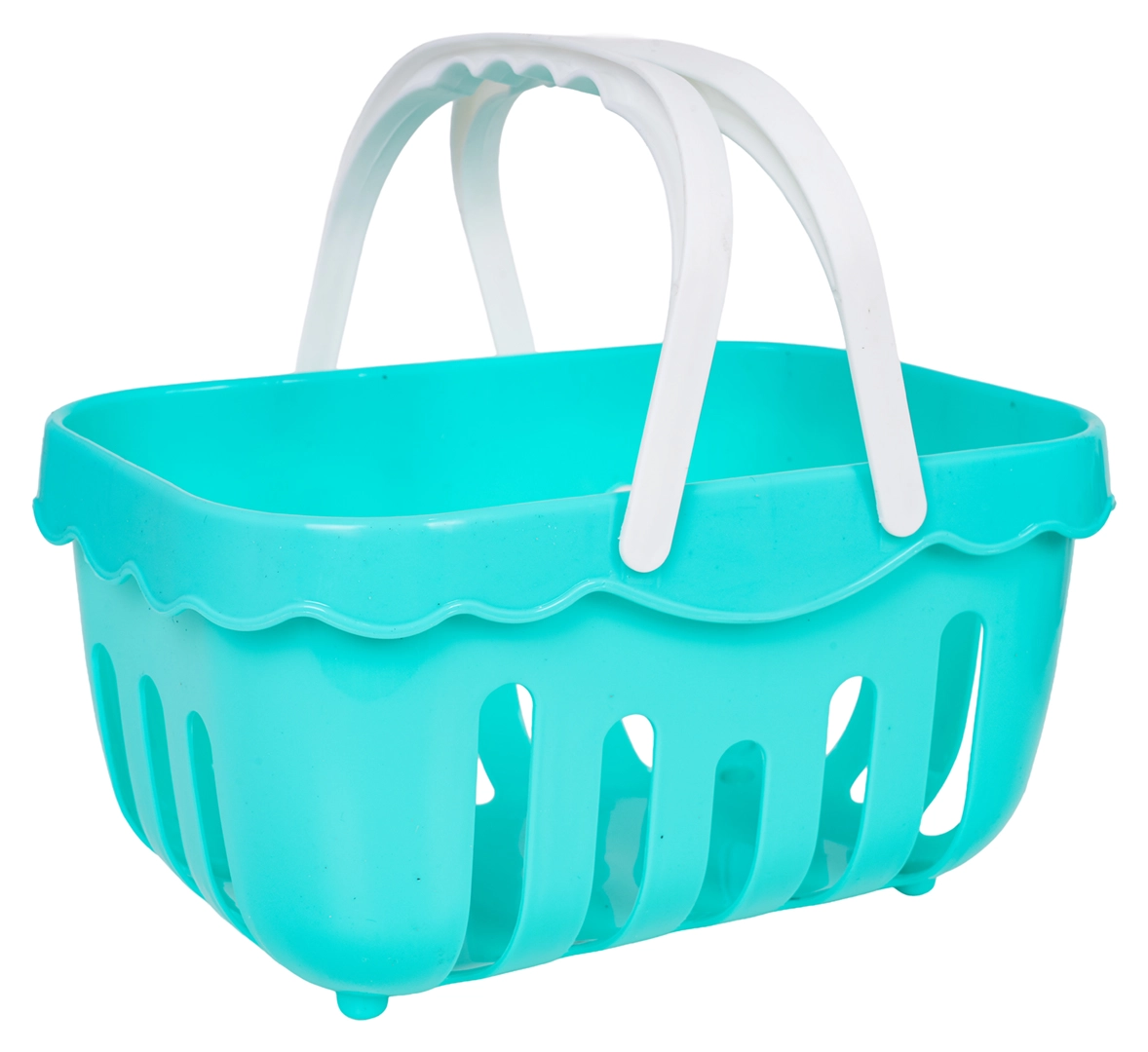 Velika košarica za kupnju i raznolik set voća i povrća, uključujući komade s čičkom, uče prepoznavati namirnice i vježbaju finu motoriku pri rezanju.