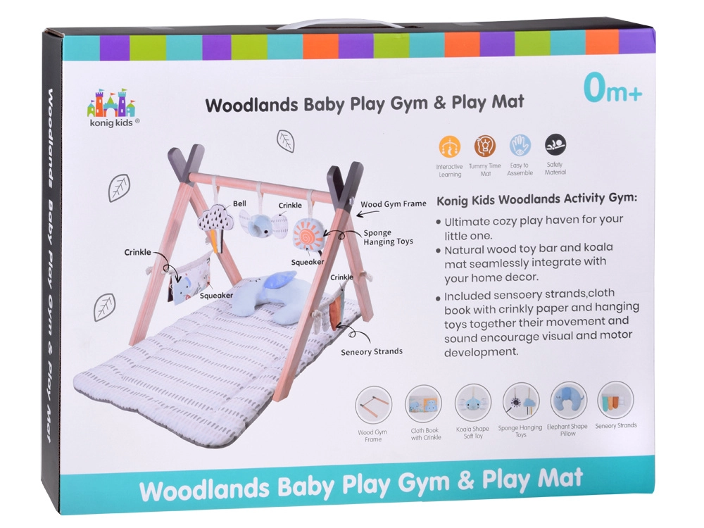 Stilska drvena baby gym nudi bebi udoban prostor na trbuščiću i na leđima, dok meke viseće igračke mame na istezanje, hvatanje i otkrivanje različitih tekstura. Kontrastni elementi, šuškavi materijali i zviždaljke prirodno stimuliraju vid, sluh i dodir.