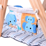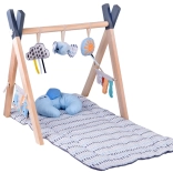 Stvorite za svoju bebu sigurno i poticajno mjesto za igru i razvoj s ovom drvenom gimnastikom i mekom edukativnom podlogom. Prirodno drvo, viseće senzoričke igračke (obláčić, sunce, slonić) i potporni jastučić potiču koordinaciju ruka–oko, motoriku i osjetilnu percepciju. Jednostavno održavanje, stabilna konstrukcija i univerzalan dizajn za svaki interijer.