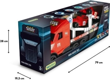 Veliki transporter Magic Truck Action Formula 1 oduševit će sve male ljubitelje automobilizma i utrka. Realistično izrađen tegljač s dugom poluprikolicom prevozi dva priložena bolida F1, koja možete lako ukrcati pomoću rampi. Poluprikolica je odvojiva i može se spojiti na kabinu na dva načina, što proširuje mogućnosti igre.