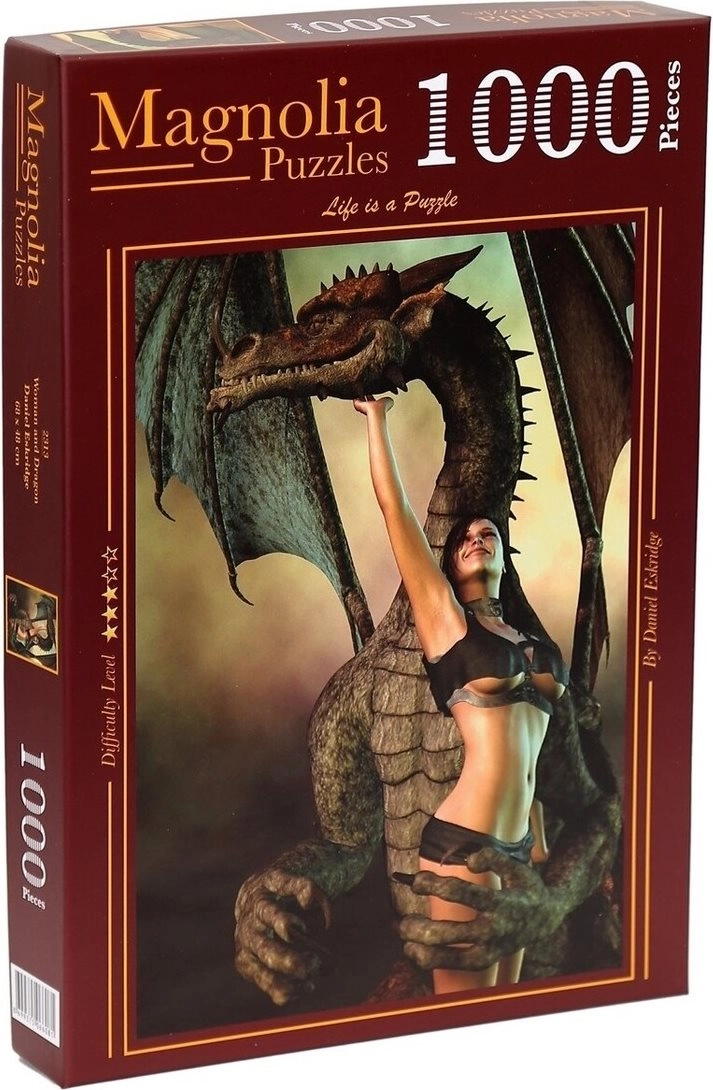 Stilska slagalica s motivom djevojke i zmaja za zahtjevnije slaganje. 1000 dijelova pruža sate zabave i opuštanja, gotova slika ima dimenzije cca 48 × 68 cm – idealno za uokviravanje.