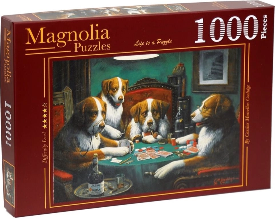 Popularni motiv „psi za poker stolom” dolazi do izražaja u velikom formatu i nudi ugodan izazov za početnike i napredne slagatelje. 1000 kvalitetnih dijelova precizno se uklapa i stvara čvrstu, živopisnu sliku koja će lijepo izgledati na zidu ili u okviru.