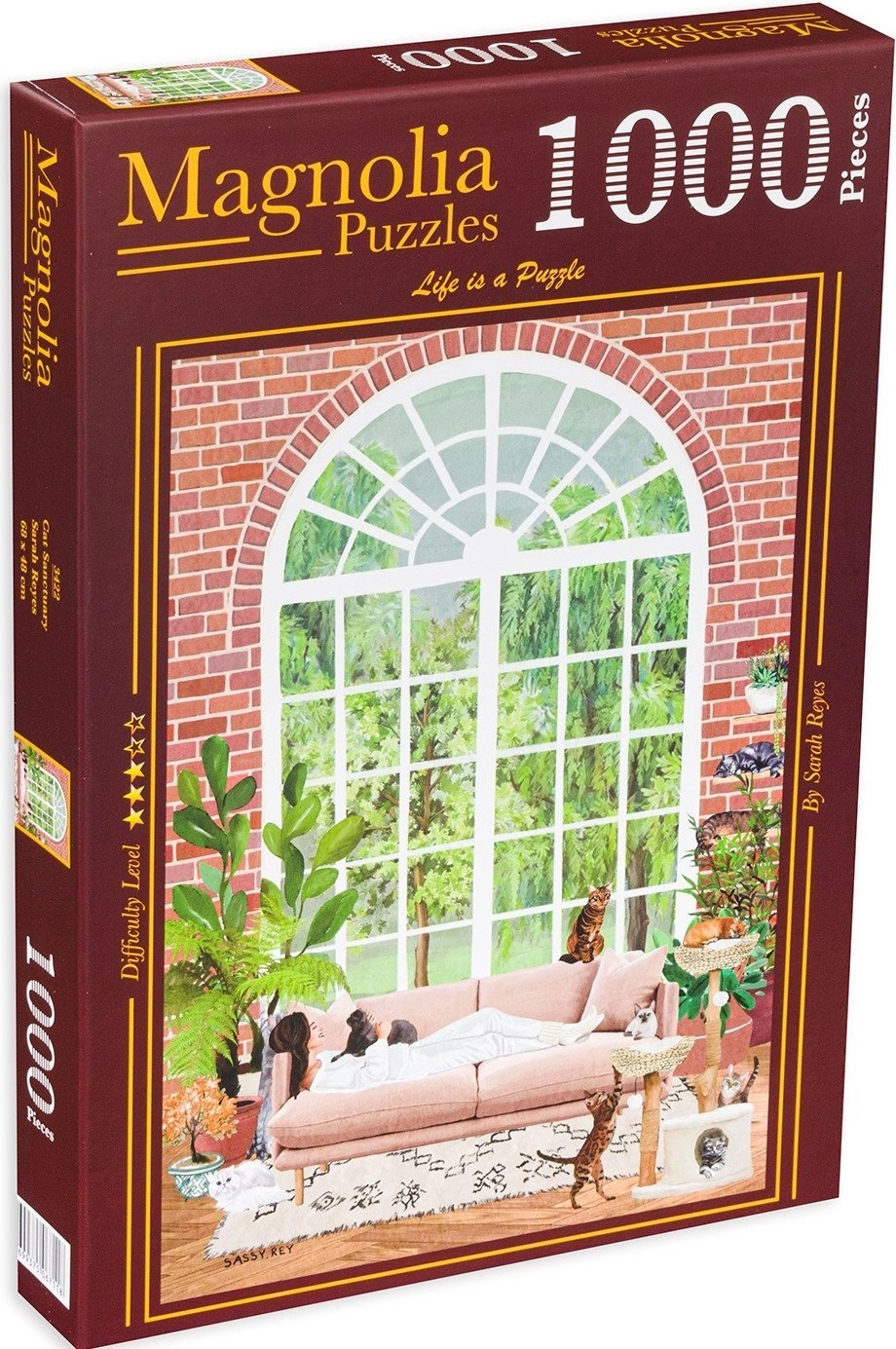 Uživajte u trenucima opuštanja s elegantnim puzzleom „Mačje utočište“. Tisuću pažljivo izrezanih dijelova stvara dojmljivu sliku idealnu za uokvirivanje. Zahvaljujući dimenziji cca 48 × 68 cm, gotovo djelo lijepo se ističe na zidu ili polici.