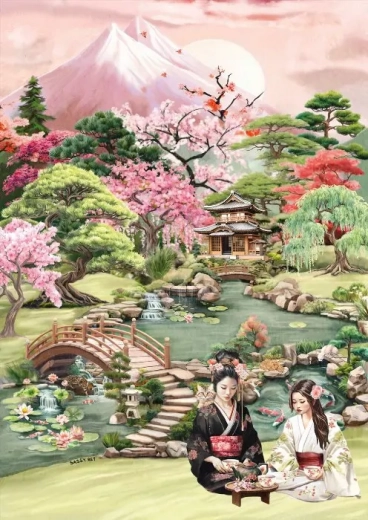 - Detaljan motiv Čajnog vrta s ugodnim bojama.