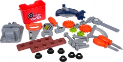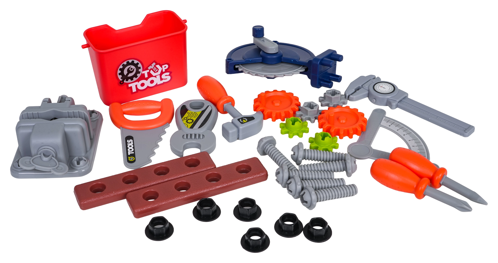 dio za zavrtanje pribl. 13 × 3 cm; pila pribl. 11 × 9 cm; škripac pribl. 12,5 × 8 cm; nasadne glave pribl. 5,5 × 2,5 cm; podesivi kutomjer pribl. 9 × 9 cm; podesivi ključ pribl. 8,5 × 4,5 cm; pomično mjerilo pribl. 14 × 5,5 cm; vijci pribl. 5,5 cm; nastavci pribl. 6 cm; nastavci/„kapice” promjer pribl. 2,5 cm; veliki zupčanici promjer pribl. 5 cm, mali pribl. 2,5 cm