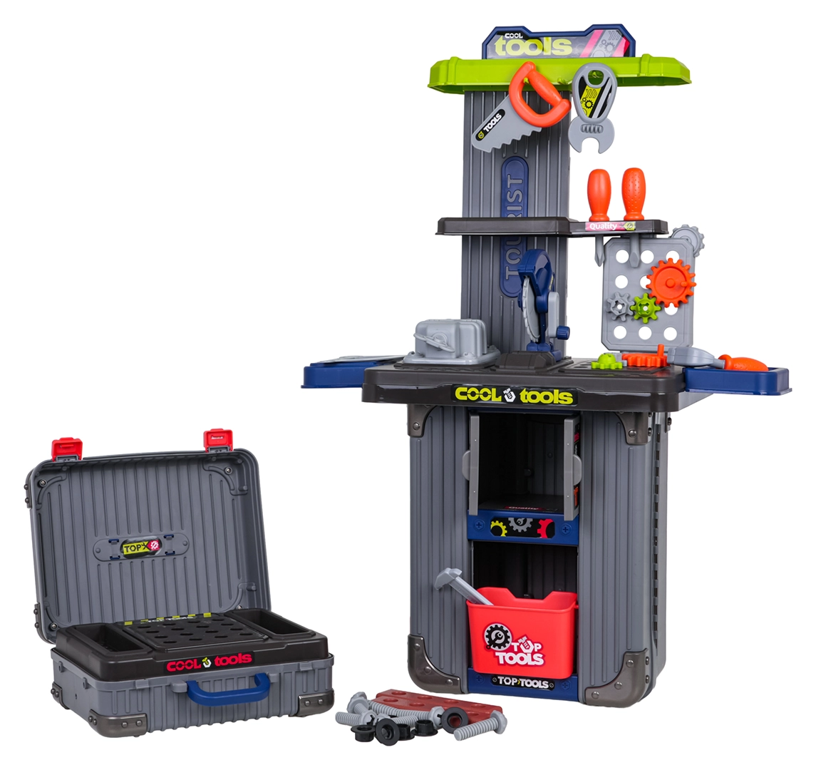 Ovaj pametni set 3u1 spaja dva kovčega i bogat set alata u jedan prijenosni radni svijet. Djeca lako sastave vlastiti radni stol sa škripcem, policama i pegboardom, a nakon igre sve ponovno pospreme u mobilne kovčege. Kvalitetna plastika odolijeva intenzivnoj upotrebi i jamči dug vijek trajanja.