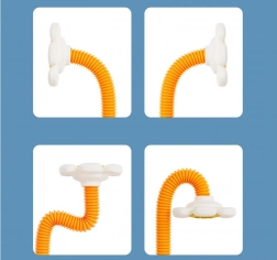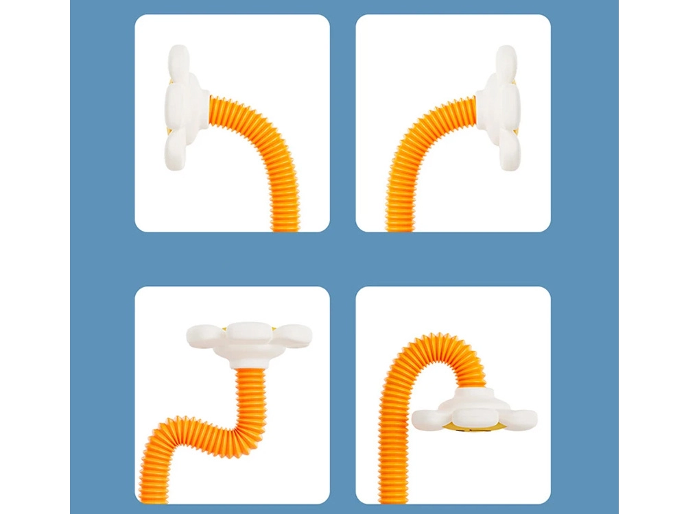 Praktično fleksibilno crijevo omogućuje usmjeravanje mlaza točno tamo gdje je potrebno, a zamjenjivi nastavci stvaraju različite fontanske efekte – od nježnog rominjanja do razigranog špricanja. Stabilne vakuumske čašice drže set na mjestu i na glatkim pločicama i na rubu kade.