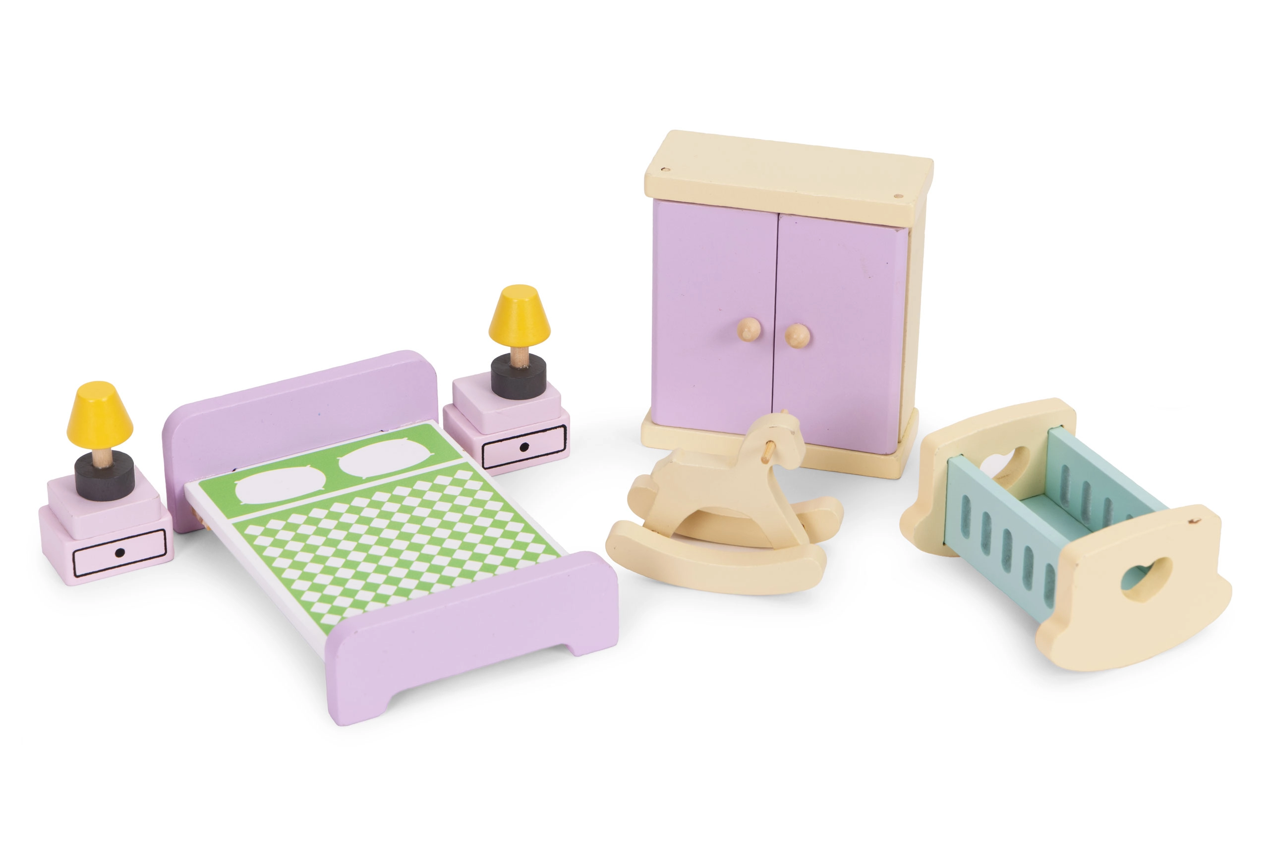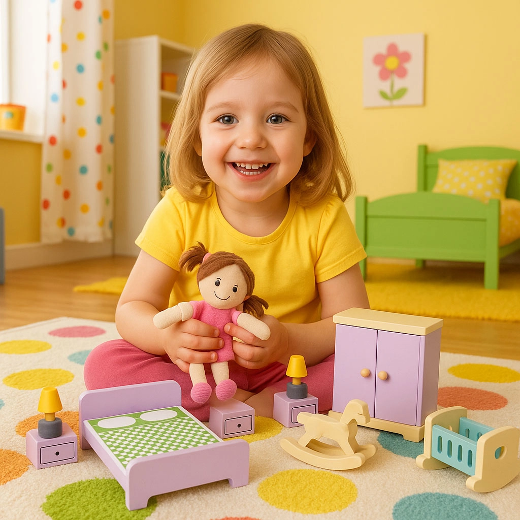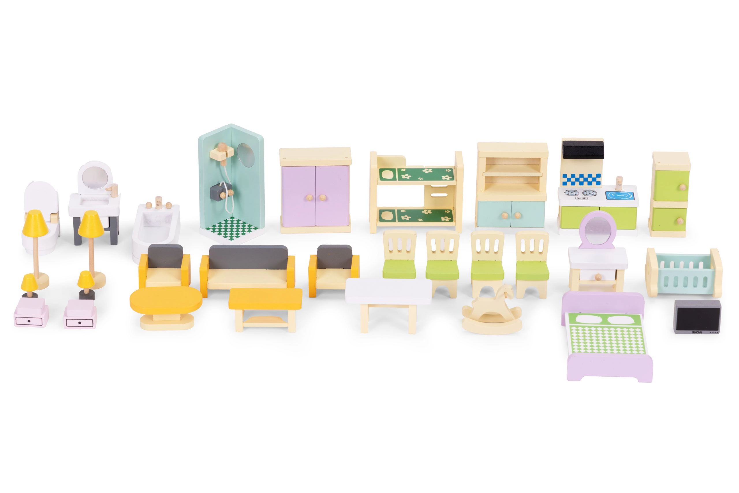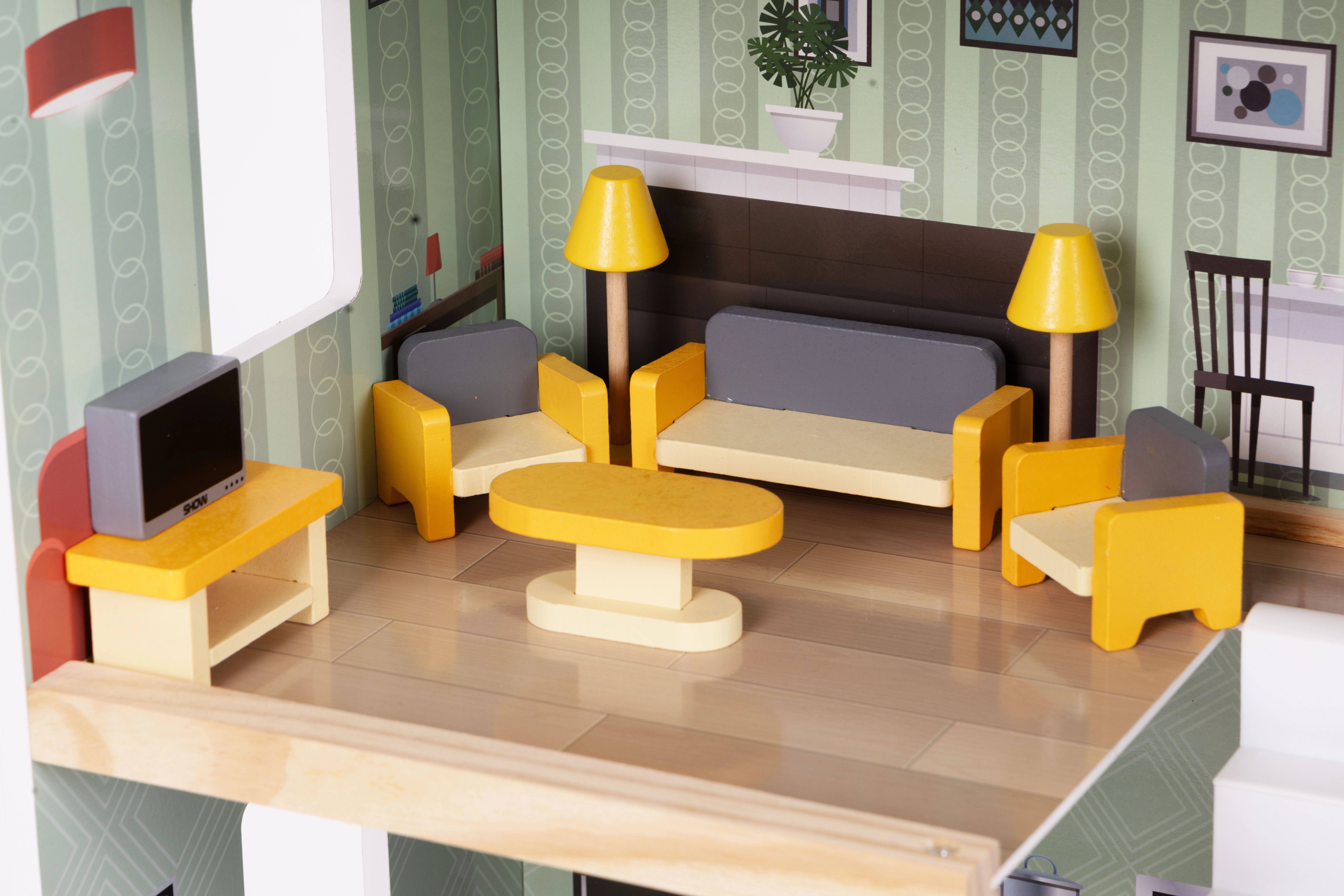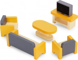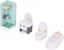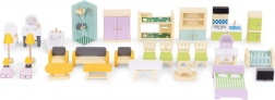 Stilski set od 30 drvenih komada namještaja za opremanje dnevnog boravka, spavaće sobe, kuhinje, kupaonice i blagovaonice. Idealan za manje lutke i kompaktne kućice. Sigurne zaobljene rubove, izdržljiva izrada i jednostavno održavanje potiču kreativnu igru, suradnju i razvoj fine motorike kod djece od 3 godine naviše.