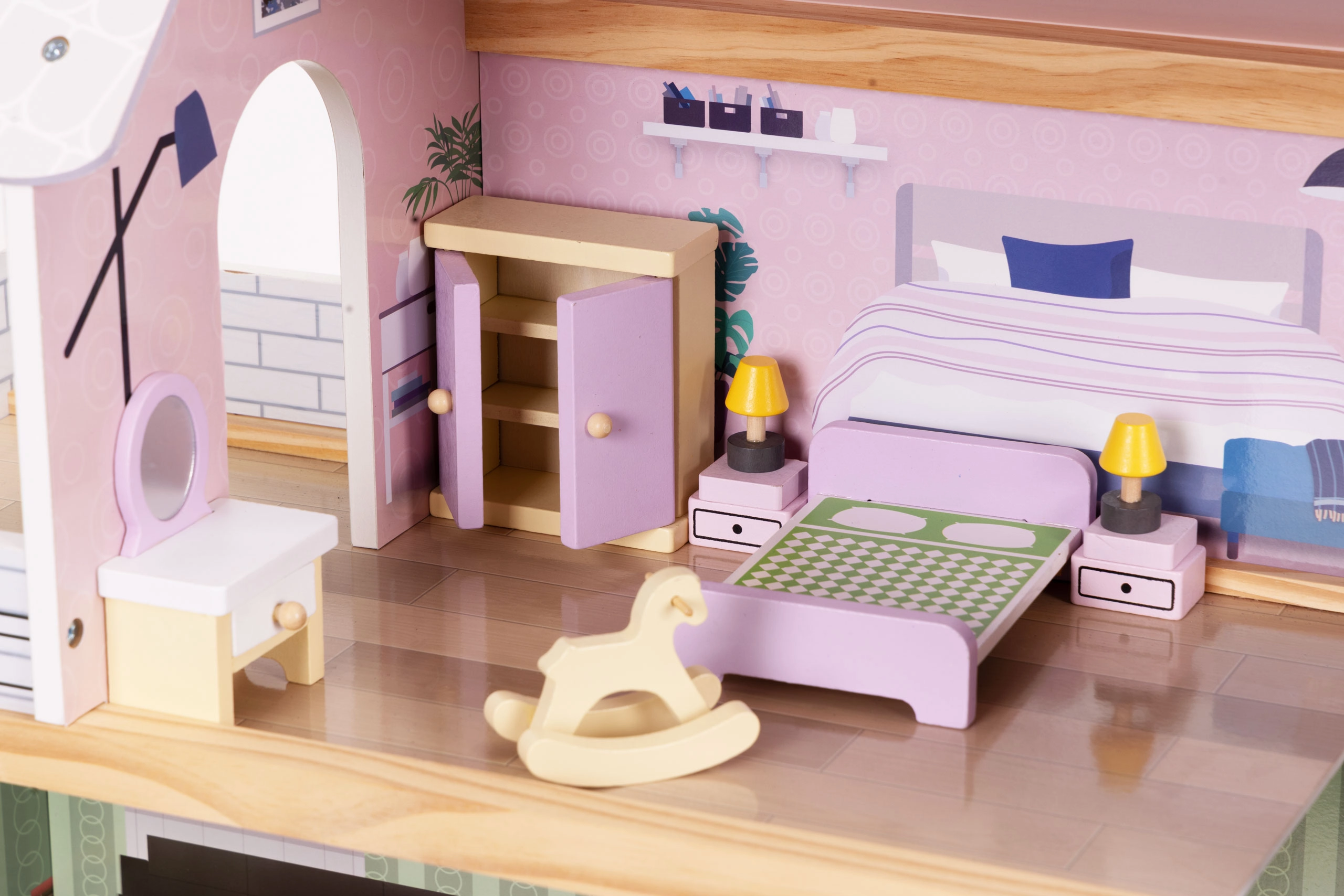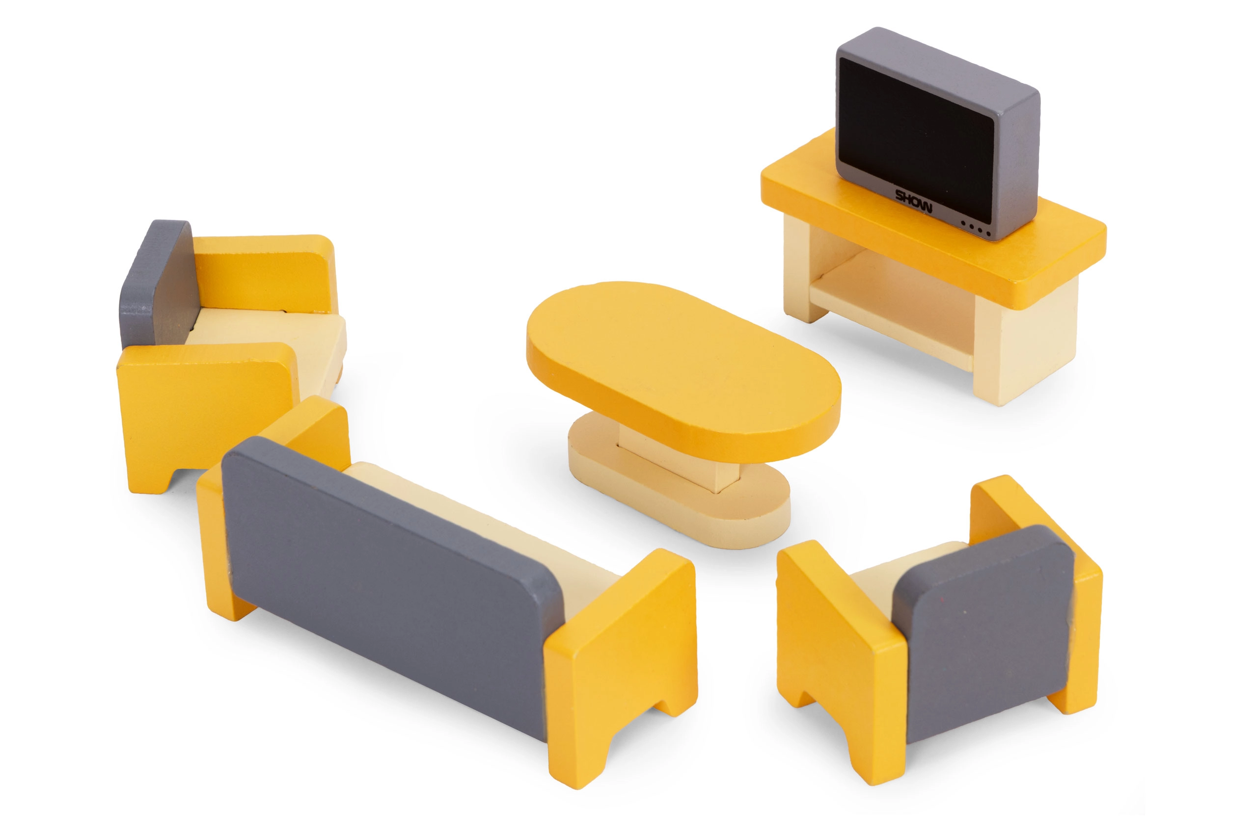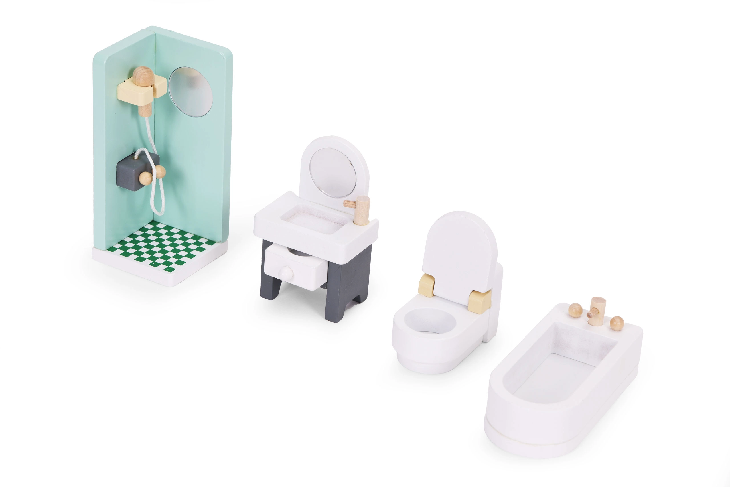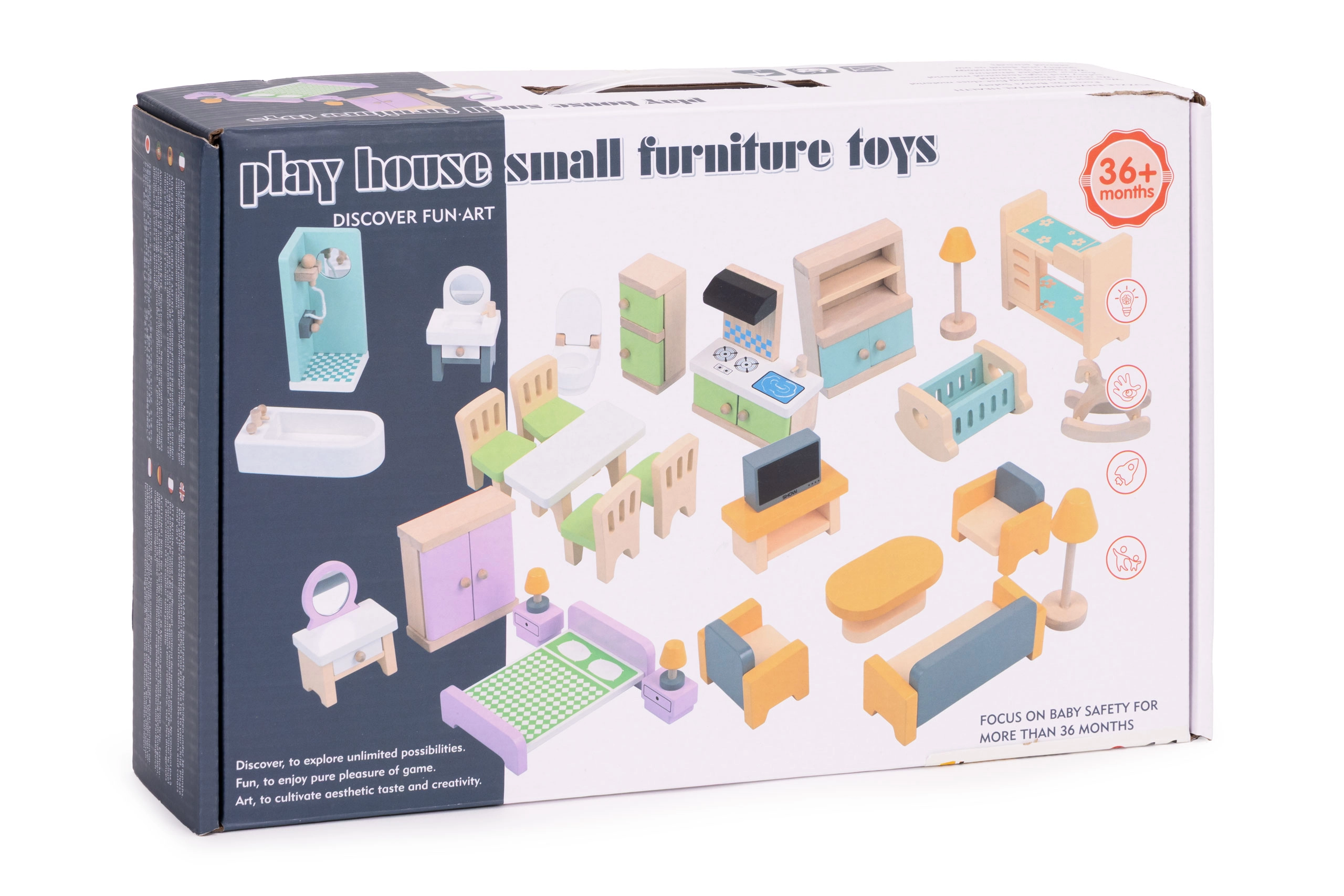 Stilski set od 30 drvenih komada namještaja za opremanje dnevnog boravka, spavaće sobe, kuhinje, kupaonice i blagovaonice. Idealan za manje lutke i kompaktne kućice. Sigurne zaobljene rubove, izdržljiva izrada i jednostavno održavanje potiču kreativnu igru, suradnju i razvoj fine motorike kod djece od 3 godine naviše.