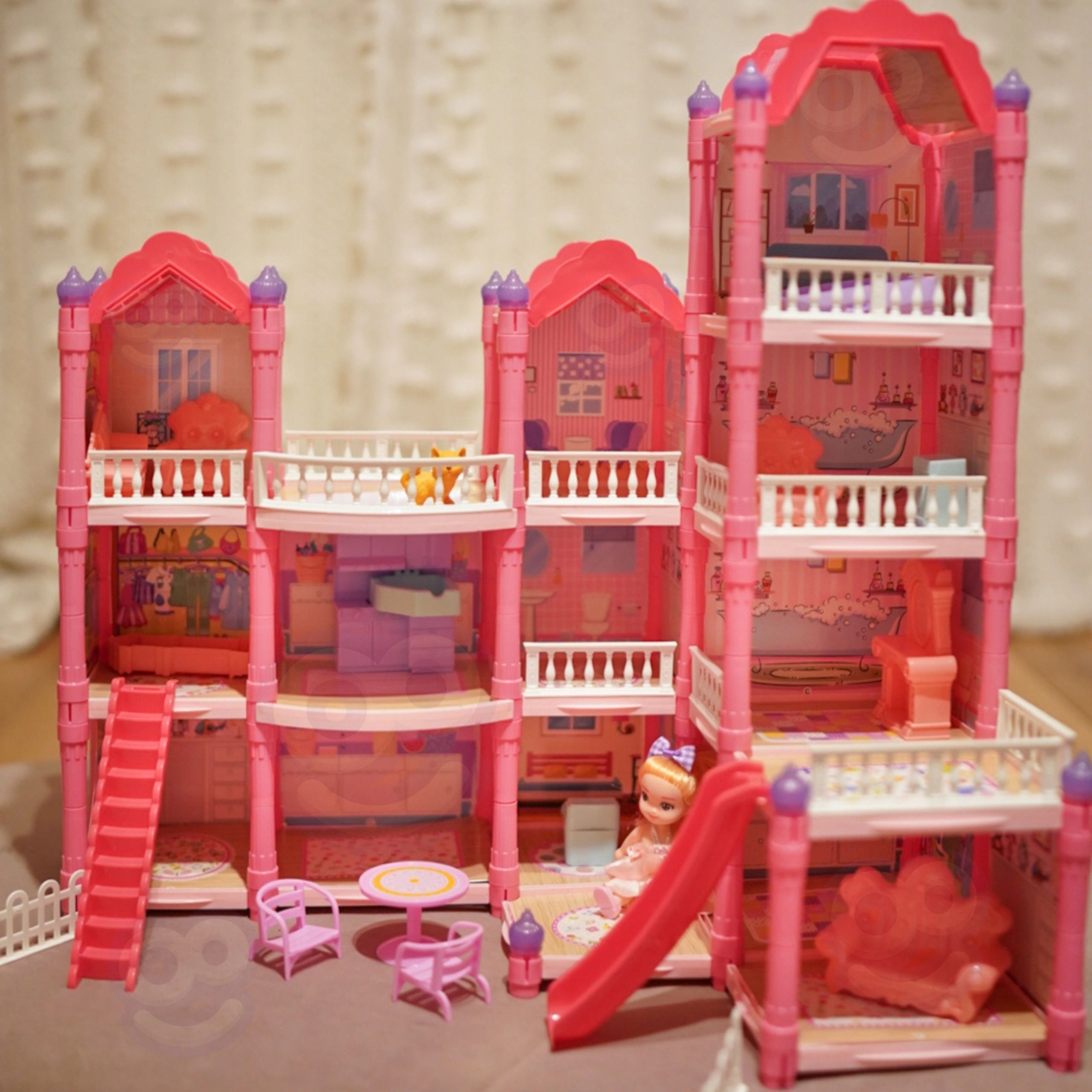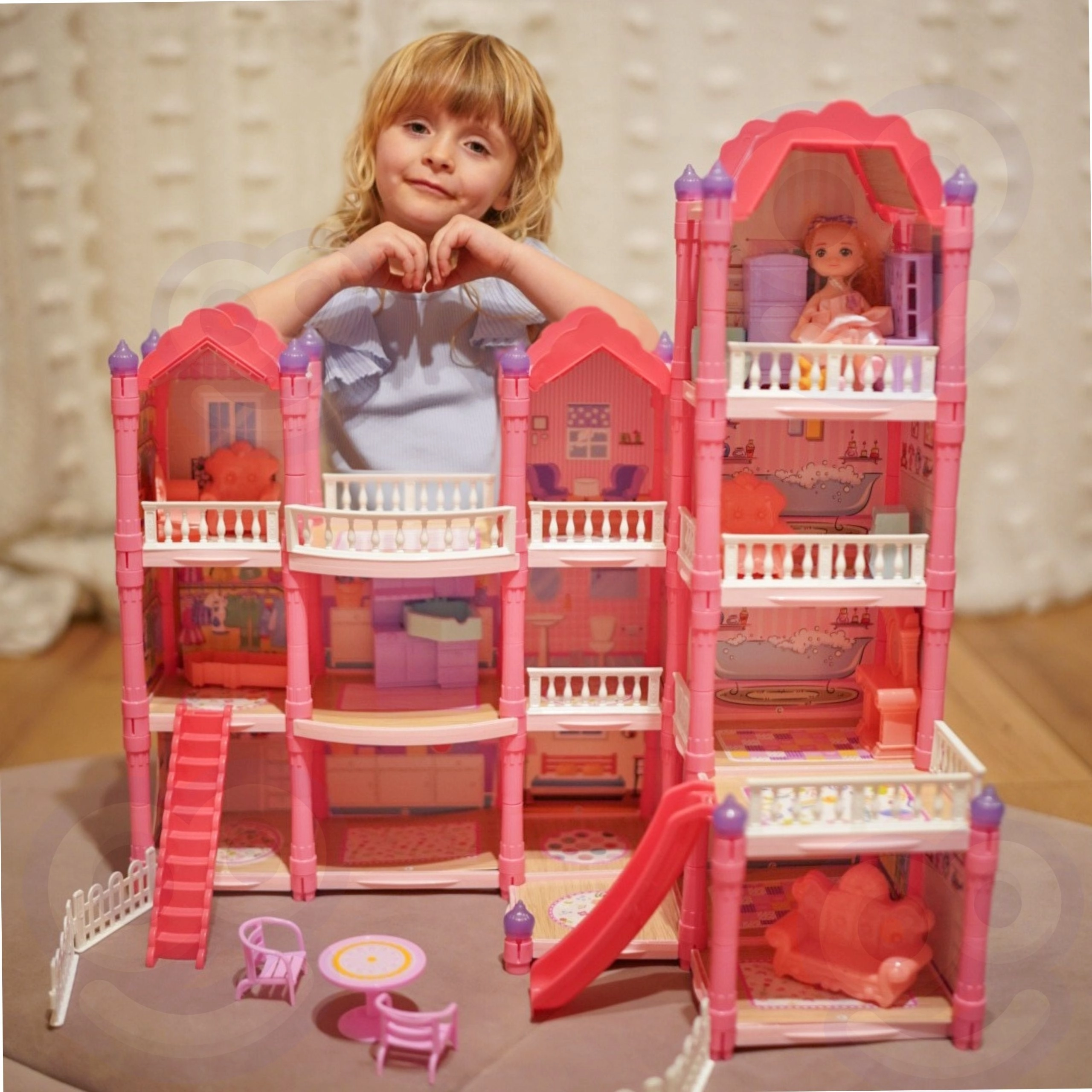 Otkrijte čarobnu trokatnu kućicu za lutke s ružičastim krovom, bogatom opremom i noćnim osvjetljenjem. Set nudi 296 dijelova uključujući sladak namještaj, dodatke i lutku, pa djeca mogu sama urediti svaku sobu. Tobogan, stepenice i terasa dodaju dodatnu zabavu i potiču kreativnost, maštu i finu motoriku.