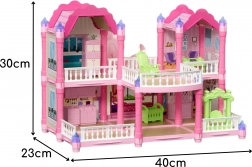 Kućica, lutka, mačić, namještaj i dekorativni elementi (stupovi, tornjići, ograda, stepenice)