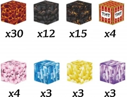- 30× crveno-crne kocke; 12× sive kocke; 16× crno-narančaste kocke; 4× TNT kocke; 4× ružičaste kocke; 3× plave kocke; 3× ljubičaste kocke; 2× žute kocke