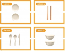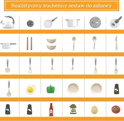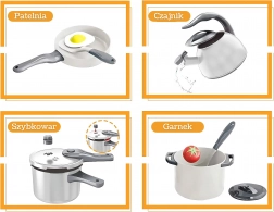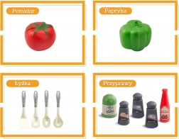 - Lonci s poklopcima i ručkama, tava s jajem na oko, čajnik, tanjuri, zdjelice, pribor za jelo (vilice, žlice, štapići, lopatice), soljenka, paparjenka, povrće (rajčica, paprika), bočice s umacima/začinima