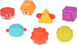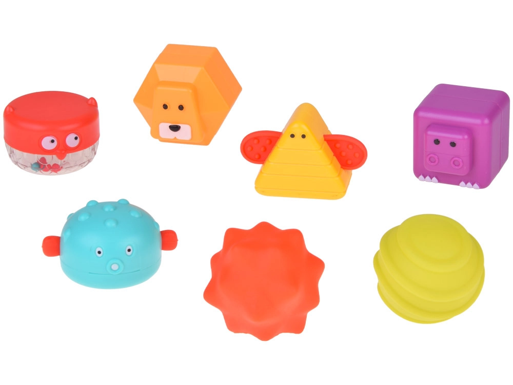 Šarene gumice omogućuju lako umetanje i vađenje dijelova, vježbaju hvat, preciznost i snagu prstiju. Dio seta je 7 raznolikih oblika i malo zrcalce za senzorno istraživanje.