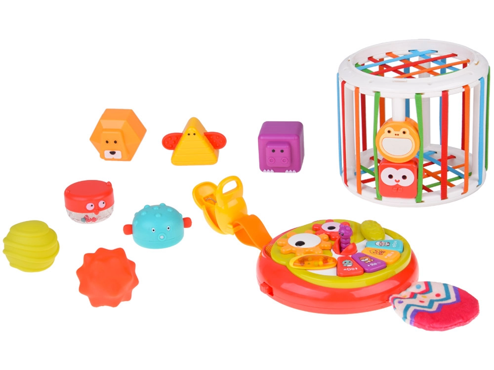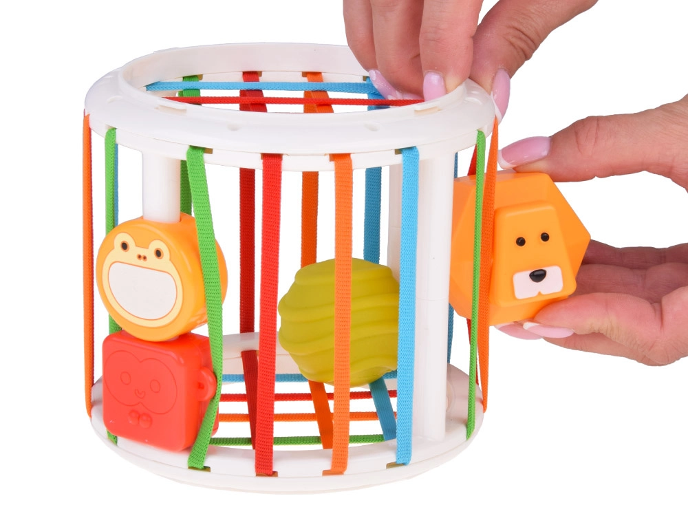 Sorter se sastoji od elastičnih šarenih traka koje omogućuju lako umetanje i vađenje dijelova te prirodno razvijaju hvat, snagu i preciznost prstiju. Tu je i malo sigurno zrcalce za istraživanje vlastitog odraza te set 7 raznobojnih elemenata za umetanje. Cjelina potiče sluh, vid i dodir, podržava koncentraciju i samostalno istraživanje.