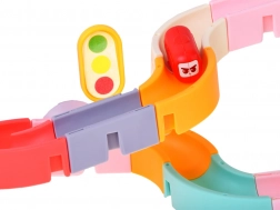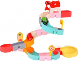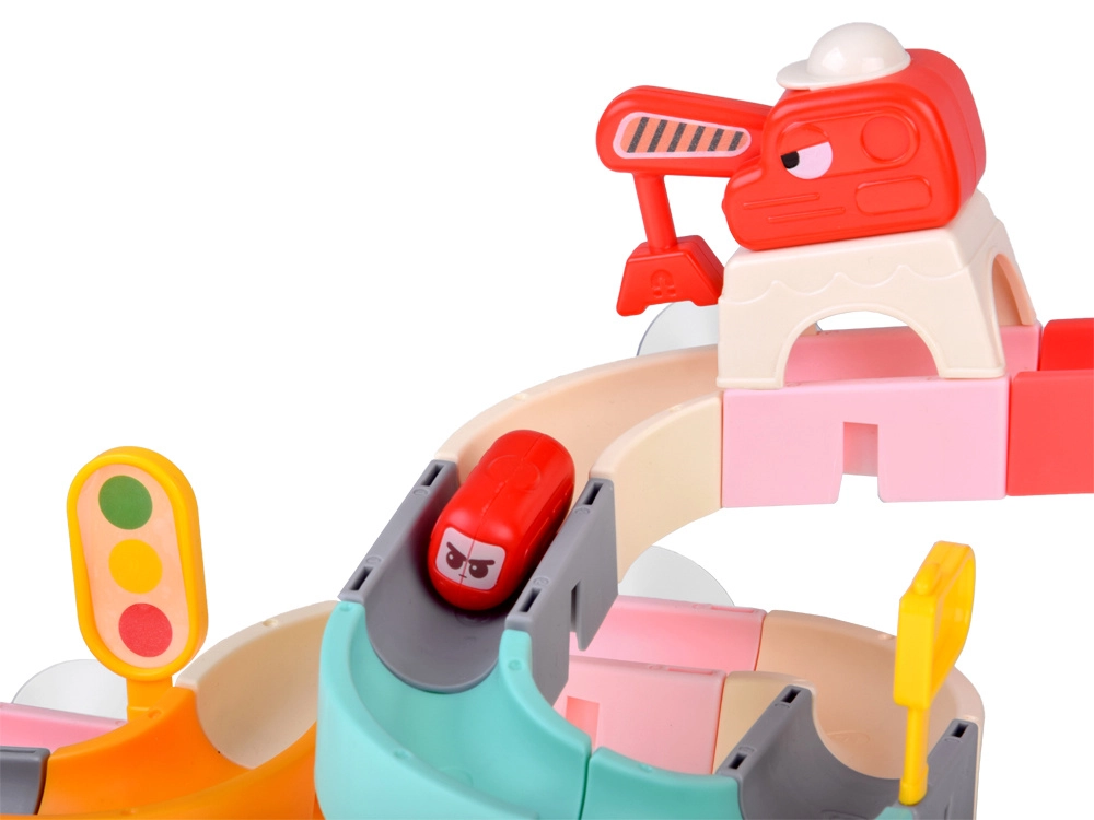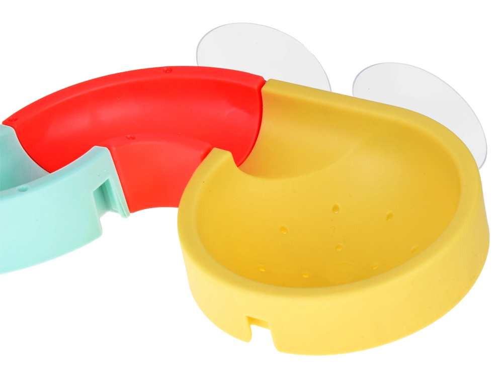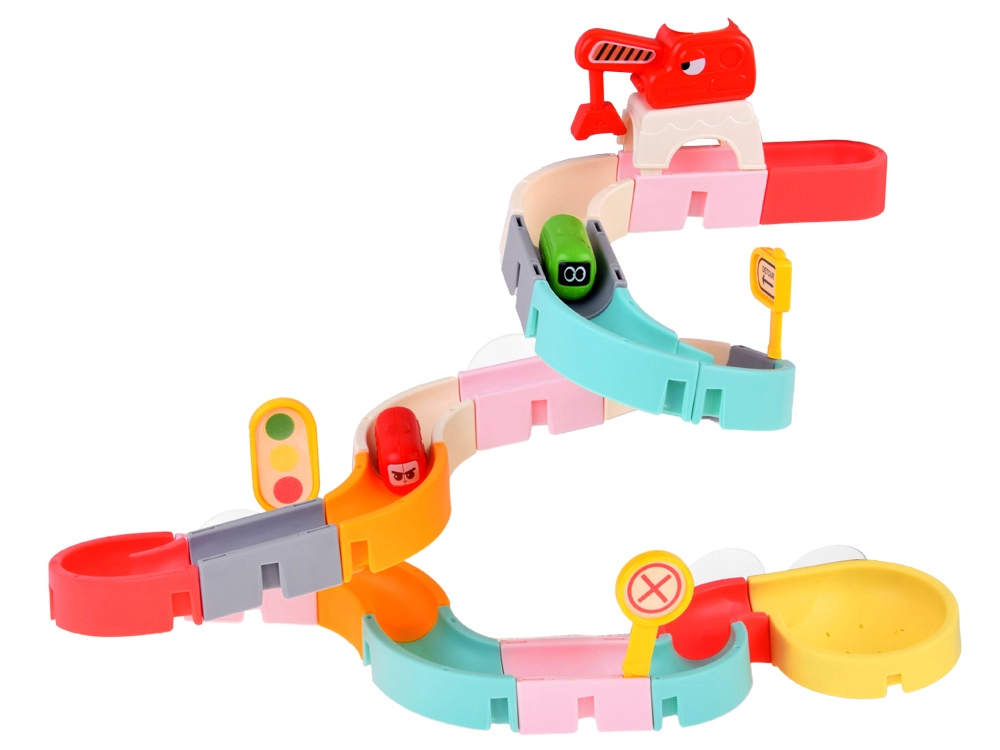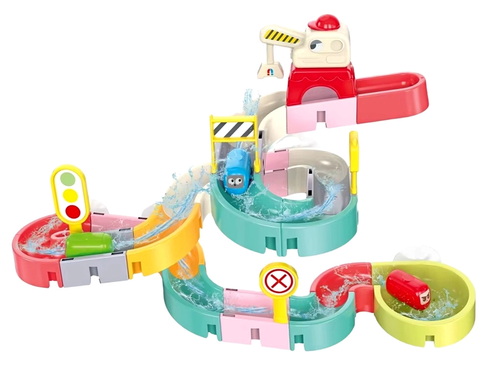 Ovaj kreativni set za kupanje oduševit će djecu šarenim dijelovima, prometnom tematikom i vodenim efektima. Od 37 komponenti složit ćete vijugava korita i spustove niz koje kapsula-autići plutaju i kotrljaju se uz pomoć vode. Silikonske vakuumske čašice drže elemente čvrsto na glatkim površinama, a završetak sa sitom stvara zabavan vodeni tuš.