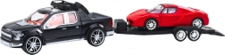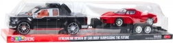 Crni pick-up s prikolicom i crveni sportaš čine realističan komplet za tematsku igru.