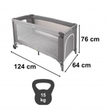 Ovaj putni krevetić idealan je za godišnje odmore, posjete i svakodnevnu uporabu kod kuće. Izdržljiva konstrukcija sa stabilnim križnim okvirom u obliku X i dva kotača s kočnicom omogućuje jednostavno pomicanje, dok protuklizne nožice osiguravaju sigurnost na svakoj podlozi. Mrežaste stranice pružaju odlično prozračivanje i stalan nadzor nad djetetom.